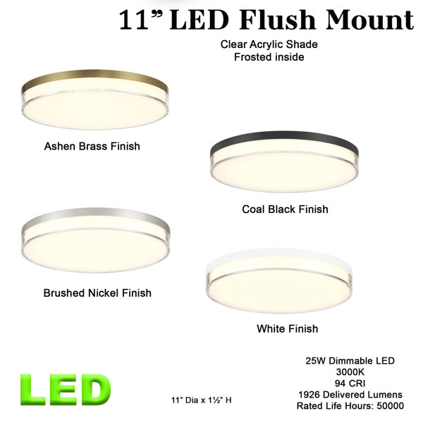 Illuminate your kitchen in style with the Wade Logan® LED flush mount light fixture. This elegant fixture finished in white, coal, or brushed nickel, adds a touch of sophistication to any decor. Its compact design allows it to be installed flush with the ceiling, making it an ideal choice for kitchens with limited space. The bulb is energy-efficient, helping you save on your electricity bills while providing ample illumination. With a wet environment location rating, this fixture is designed to withstand moisture, ensuring its longevity. The fixture is also dimmable, allowing you to adjust the brightness to suit your needs. Whether you're preparing a meal or enjoying dinner with your family, the Wade Logan® LED flush mount light fixture creates the perfect atmosphere. Its durable construction and stylish design make it a valuable addition to your home.