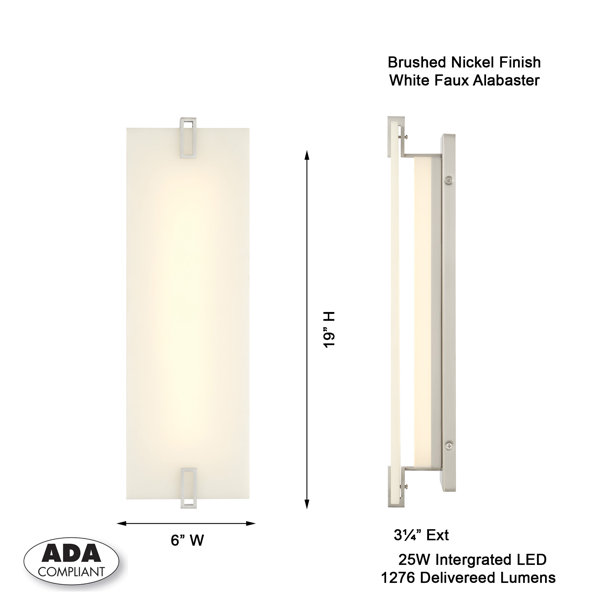 Elevate your home decor with the Claudel LED wall sconce by Latitude Run®. This modern, sophisticated lighting solution features a stunning faux alabaster shade that diffuses light beautifully, creating a warm and inviting ambiance in any room. The brushed nickel finish adds a touch of luxury and refinement, making this wall sconce an ideal choice for those seeking to add a touch of glamour to their decor. Not only is this sconce visually appealing, but it's also functional. The included LED bulb provides energy-efficient lighting, and the fixture is easy to control with a remote. Plus, it's simple to install and damp-rated, offering versatility in placement throughout your home. With its high-quality construction, you can trust that this wall sconce will last for years to come. Experience the beauty and elegance of the Claudel collection by Latitude Run® today.