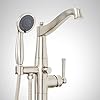 Graceful styling makes the Pendleton freestanding tub faucet perfect for an elegant, traditional bath. This tastefully designed fixture has a gently curved spout and easy-to-use controls. The multifunction hand shower allows you to switch between a full spray and a powerful massage or use both simultaneously. Made of brass and covered with a corrosion-resistant finish, the Pendleton will bring lasting beauty to your space. Signature Hardware 948659-LV Features: Covered under Signature Hardware's 25 year limited warranty Solid brass construction Includes hand shower multi function hand shower handy for rinsing down the tub or just rinsing off after a bath Single hole floor mounted installation Note: Underfloor access is required for proper installation (Installation on an existing concrete slab will require cutting and concrete removal) Signature Hardware 948659-LV Specifications: Height: 40-1/2" (bottom to top of faucet) Spout Height: 39" (deck to spout outlet) Spout Reach: 9-1/4" (center of faucet body to center of spout outlet horizontally) Flow Rate: 10.6gallons-per-minute Hand Shower Flow Rate: 1.8 gallons-per-minute Hose Length: 58" Single faucet hole required for installation