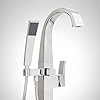 The Vilamonte Freestanding Tub Faucet is an excellent choice to mount alongside your modern bathtub. Clean lines and graceful curves adorn the gooseneck spout and easy-to-turn lever handle. A convenient, rectangular hand shower is always within reach and attached to a flexible metal hose for full-body rinsing. A premium, tarnish-resistant finish and solid brass construction ensure the Vilamonte's quality matches its beauty. Signature Hardware 948665-LV Features: Covered under Signature Hardware's 25 year limited warranty Solid brass construction Includes hand shower - single function hand shower handy for rinsing down the tub or just rinsing off after a bath Single Hole floor mounted installation Rough in valve needed for installation sold separately Signature Hardware 948665-LV Specifications: Height: 43-1/2" (bottom to top of faucet) Spout Height: 40" (deck to spout outlet) Spout Reach: 9" (center of faucet body to center of spout outlet horizontally) Flow Rate: 10.5gallons-per-minute Hand Shower Flow Rate: 1.8 gallons-per-minute Hose Length: 58" Faucet Holes: 1 (minimum number of holes required for installation)