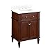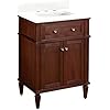 Made for smaller spaces, the compact 24" Elmdale Vanity is just as elegant as it is functional. Featuring a finish that brings out the warmth of its solid mahogany build, this vanity adds character to any traditional or transitional bath. Complete with an adjustable interior shelf and drawer, there is plenty of storage for bathroom supplies. Signature Hardware 951590-RUMB Included Components: Mahogany vanity cabinet with 2 doors and 1 drawer Quartz vanity top with one sink Mirror is not included and must be purchased separately Faucet is not included and must be purchased separately Covered under Signature Hardware's 25 year limited Cabinet Features: Constructed from mahogany Free standing installation - vanity is seated on the floor with wall anchors 2 door design provides easy access to storage space Single full extension drawer with soft-close slides allows for organized storage Soft close drawer slides operate on smooth ball-bearings and prevent drawers from slamming shut Vanity cabinet includes matching decorative hardware All dimensions are +/- 1/2" Vanity Top Features: Arctic White and Feathered White constructed from quartz Vanity top includes single basin sink Three pre-drilled faucet holes Rear drain location increases available space under the sink Faucet hole drilled to fit a standard 1-1/2" sink Includes a matching backsplash and a white porcelain sink Each stone top is carved from a single piece of stone and will feature natural variations See Installation Instructions for directions to attach the vanity top and sink All dimensions are +/- 1/2" Cabinet Specifications: Number of Doors: 2 Number of Drawers: 1 Vanity Top Specifications: Vanity Top Width: 26" (left edge to right edge) Vanity Top Depth: 22" (front edge to back edge) Backsplash Height: 4" Number of Basins: 1 Number of Faucet Holes: 3 Faucet Centers: 8" Drain Outlet Connection: 1-1/2"