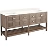 Signature Hardware 952441-Rumb-0 Included Components: Granite, Marble or Quartz vanity top with double undermount porcelain sinks Mirror is not included and must be purchased separately Faucet is not included and must be purchased separately Covered under Signature Hardware's 25 year limited Cabinet Features: Free standing installation vanity is seated on the floor with wall anchors 4 door design provides easy access to storage space 4 full extension drawers with soft-close sides allows for organized storage Soft close drawer slides operate on smooth ball-bearings and prevent drawers from slamming shut Vanity Top Features: Finish Ash Brown / Absolute Black comes with a granit vanity top Finish Ash Brown / Carrara Marble comes with a marble vanity top Finish Ash Brown / Arctic White comes with a quartz vanity top Vanity top includes 2 Undermount basin sinks constructed of Wood Rear drain location increase available space under the sink Cabinet Specifications: Number of Doors: 4 Number of Drawers: 4 Vanity Top Specifications: Vanity Top Width: 73" (left edge to right edge) Vanity Top Depth: 22" (front edge to back edge) Backsplash Height: 4" Number of Basins: 2 Sink Measurements: 16" L X 11.75" W Sink Basin Measurements: 16" L X 11.75" W X 4.5" H Number of Faucet Holes: 1.5 Faucet Centers: 0" (distance between the installation holes for the faucet handles)