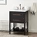 The 24" Robertson Console Vanity has a rich black finish and antique brass pulls. A great fit for a small bathroom, this product features a U-shaped drawer and lower shelf. Signature Hardware 953330-24-UM-8 Included Components: Mahogany vanity cabinet with 1 drawer and 1 shelf Granite, marble, or quartz vanity top with single undermount vitreous china sink Mirror is not included and must be purchased separately Faucet is not included and must be purchased separately Covered under Signature Hardware's 25 year limited warranty Cabinet Features: Constructed of mahogany Free standing installation vanity is seated on the floor with wall anchors 1 full extension drawer with soft-close slides allows for organized storage Soft close drawer slides operate on smooth ball-bearings and prevent drawers from slamming shut Vanity cabinet includes matching decorative hardware Vanity Top Features: Absolute Black constructed from granite, Arctic White and Feathered White constructed from quartz, Carrara Marble constructed from marble Vanity top includes 1 undermount basin sink constructed of vitreous china 3 pre-drilled faucet holes Polished Carrara Marble is sourced from Italy and Granite is A-grade Each stone top is carved from a single piece of stone and will feature natural variations Vitreous china sink with overflow included See Installation Instructions for directions to attach the vanity top and sink Cabinet Specifications: Cabinet Width: 24" (from left to right) Cabinet Height: 34-3/8" (from top to bottom) Cabinet Depth: 20-7/8" (from front to back) Number of Drawers: 1 Number of Shelves: 1 Vanity Top Specifications: Vanity Top Width: 25" (left edge to right edge) Vanity Top Depth: 22" (front edge to back edge) Backsplash Height: 4" Number of Basins: 1 Sink Measurements: 18-5/8" L X 15" W X 7-3/4" H Sink Basin Measurements: 16" L X 12-1/2" W X 6" H Number of Faucet Holes: 3 Faucet Centers: 8" (distance between the installation holes for the faucet handles)