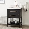 The 24" Robertson Console Vanity has a rich black finish and antique brass pulls. A great fit for a small bathroom, this product features a U-shaped drawer and lower shelf. Signature Hardware 953330-24-RUMB-1 Included Components: Mahogany vanity cabinet with 1 drawer and 1 shelf Granite, marble, or quartz vanity top with single undermount vitreous china sink Mirror is not included and must be purchased separately Faucet is not included and must be purchased separately Covered under Signature Hardware's 25 year limited warranty Cabinet Features: Constructed of mahogany Free standing installation vanity is seated on the floor with wall anchors 1 full extension drawer with soft-close slides allows for organized storage Soft close drawer slides operate on smooth ball-bearings and prevent drawers from slamming shut Vanity cabinet includes matching decorative hardware Vanity Top Features: Absolute Black constructed from granite, Arctic White and Feathered White constructed from quartz, Carrara Marble constructed from marble Vanity top includes 1 undermount basin sink constructed of vitreous china Single pre-drilled faucet hole Polished Carrara Marble is sourced from Italy and Granite is A-grade Each stone top is carved from a single piece of stone and will feature natural variations Vitreous china sink with overflow included See Installation Instructions for directions to attach the vanity top and sink Cabinet Specifications: Cabinet Width: 24" (from left to right) Cabinet Height: 34-3/8" (from top to bottom) Cabinet Depth: 20-7/8" (from front to back) Number of Drawers: 1 Number of Shelves: 1 Vanity Top Specifications: Vanity Top Width: 25" (left edge to right edge) Vanity Top Depth: 22" (front edge to back edge) Backsplash Height: 4" Number of Basins: 1 Sink Measurements: 18-1/4" L X 14" W X 7-5/8" H Sink Basin Measurements: 16" L X 11-3/4" W X 6" H Number of Faucet Holes: 1
