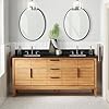 Capture a mid-century modern look with the 72" Aliso Teak Double Vanity with Rectangular Undermount Sinks. Made of stunning yet durable teak, a natural finish highlights its organic texture while minimal hardware offers a sleek accent. Horizontal planked doors and tapered legs finish off the Aliso's classically cool silhouette. Both shared and individual storage is included thanks to separate main compartments below each sink area. Additionally, an adjustable shelf and three accessible drawers offer even more space for essentials. Soft-closing entry points and magnetic door catches ensure seamless everyday use with a luxurious feel