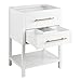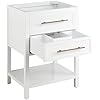 The 24" Robertson Vanity features an exposed shelf and U-shaped drawer. Designed for a rectangular undermount sink, this cabinet is a great choice for your bathroom remodel. Signature Hardware 953162-Rumb Included Components: Mahogany vanity cabinet with 1 drawer Quartz vanity top with one sink Mirror is not included and must be purchased separately Faucet is not included and must be purchased separately Covered under Signature Hardware's 25 year limited Cabinet Features: Constructed from mahogany Free standing installation - vanity is seated on the floor with wall anchors Single full extension drawer with soft-close slides allows for organized storage Soft close drawer slides operate on smooth ball-bearings and prevent drawers from slamming shut Vanity cabinet includes matching decorative hardware Vanity Top Features: Arctic White and Feathered White constructed from quartz Vanity top includes single basin sink Three pre-drilled faucet holes Rear drain location increases available space under the sink Faucet hole drilled to fit a standard 1-1/2" sink Includes a matching backsplash and white porcelain sink See installation Instructions for directions to attach the vanity top and sink Each stone top is carved from a single piece of stone and will feature natural variations Cabinet Specifications: Number of Drawers: 1 Vanity Top Specifications: Vanity Top Width: 24" (left edge to right edge) Vanity Top Depth: 21" (front edge to back edge) Backsplash Height: 4" Number of Basins: 1 Number of Faucet Holes: 3 Faucet Centers: 8" Drain Outlet Connection: 1-1/2"