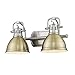 Intricate care was taken in crafting this two-light bath light from Golden Lighting, ensuring an antique elegance. Its pewter finish accentuates the classic personality evoked by this fixture. The contrasting aged brass finish shades complement with understated detail.