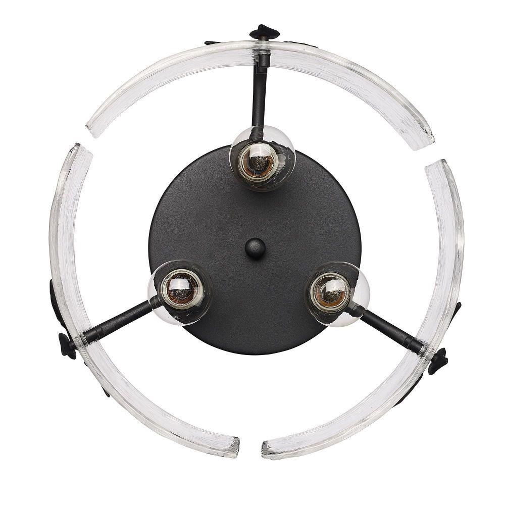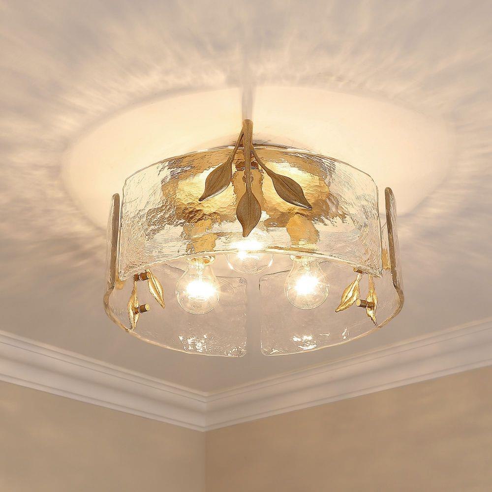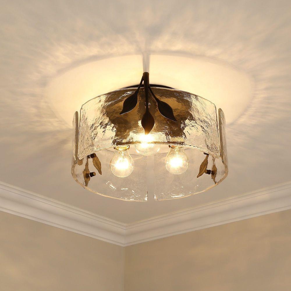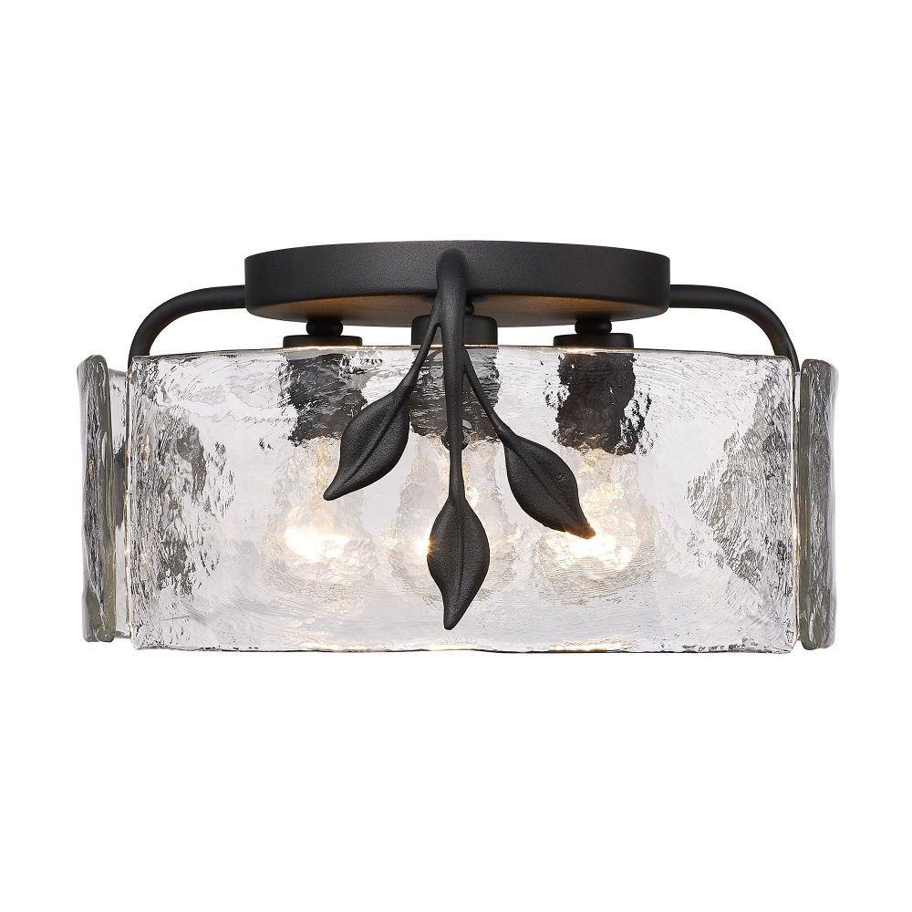 Tastefully convey your love of nature with the beautiful Calla Collection. Decorative elements like Hammered Water Glass and plant-like metal details take center stage in the transitional design. The contemporary Natural Black finish is lightly textured. Hang these low-profile, damp-rated fixtures anywhere in your home.