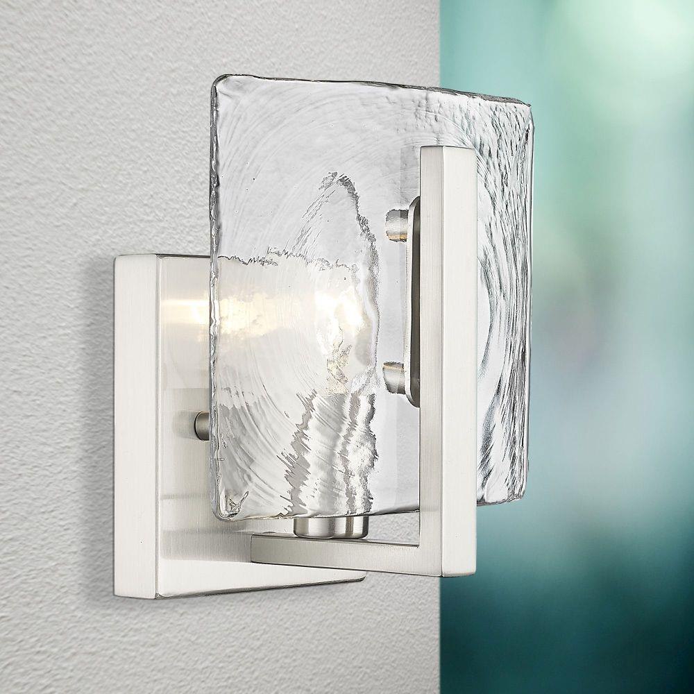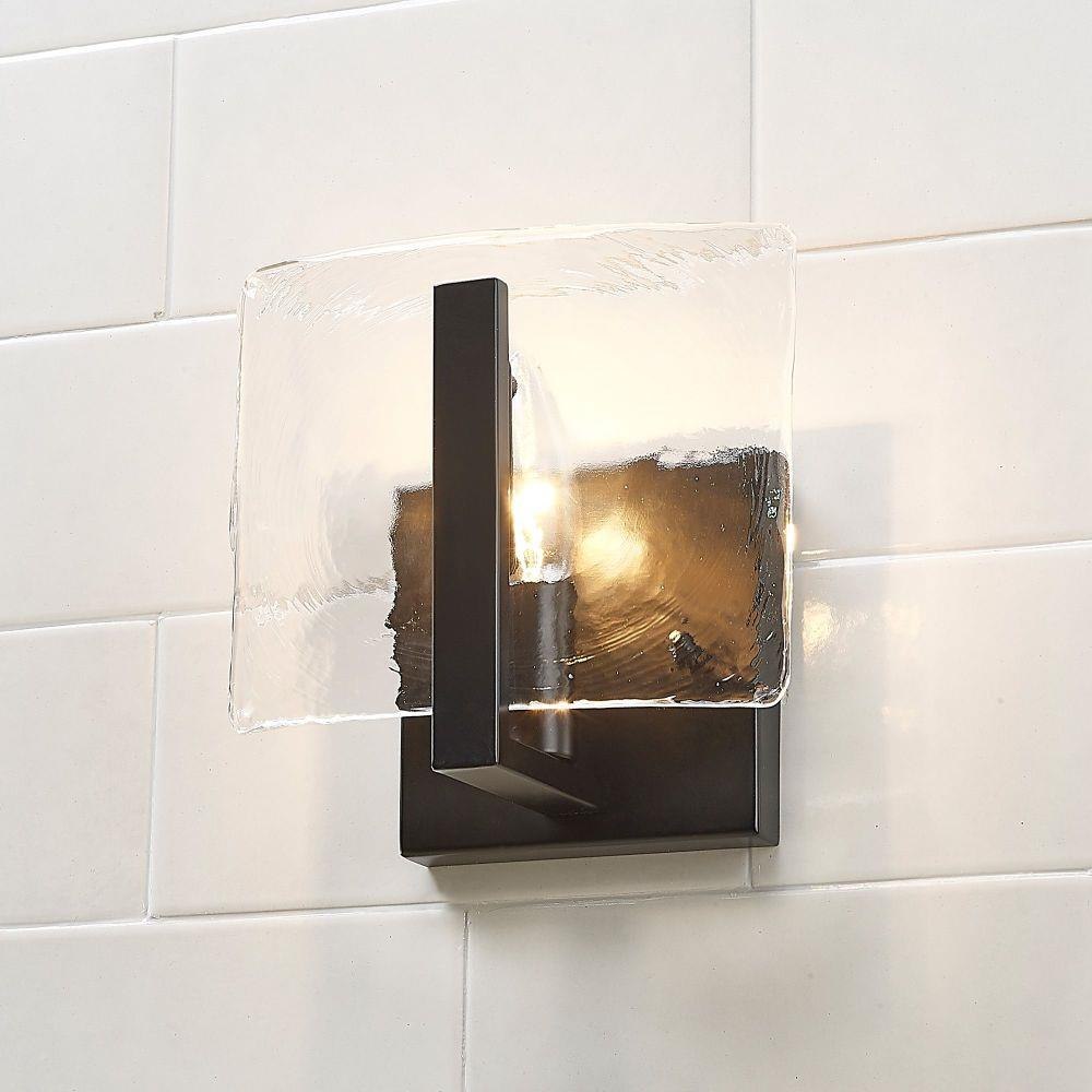 Aenon's universal style positions the series as a contemporary design perfect for transitional to modern homes. The striking Hammered Water Glass draws the eye and quickly becomes a topic of conversation and admiration. Strong masculine steel arms cradle Aenon's unique glass panels, suspending them mid-air. When lit, the Hammered Water Glass contrasts the contemporary finishes and reflect the bright light. Choose between multiple finish options.