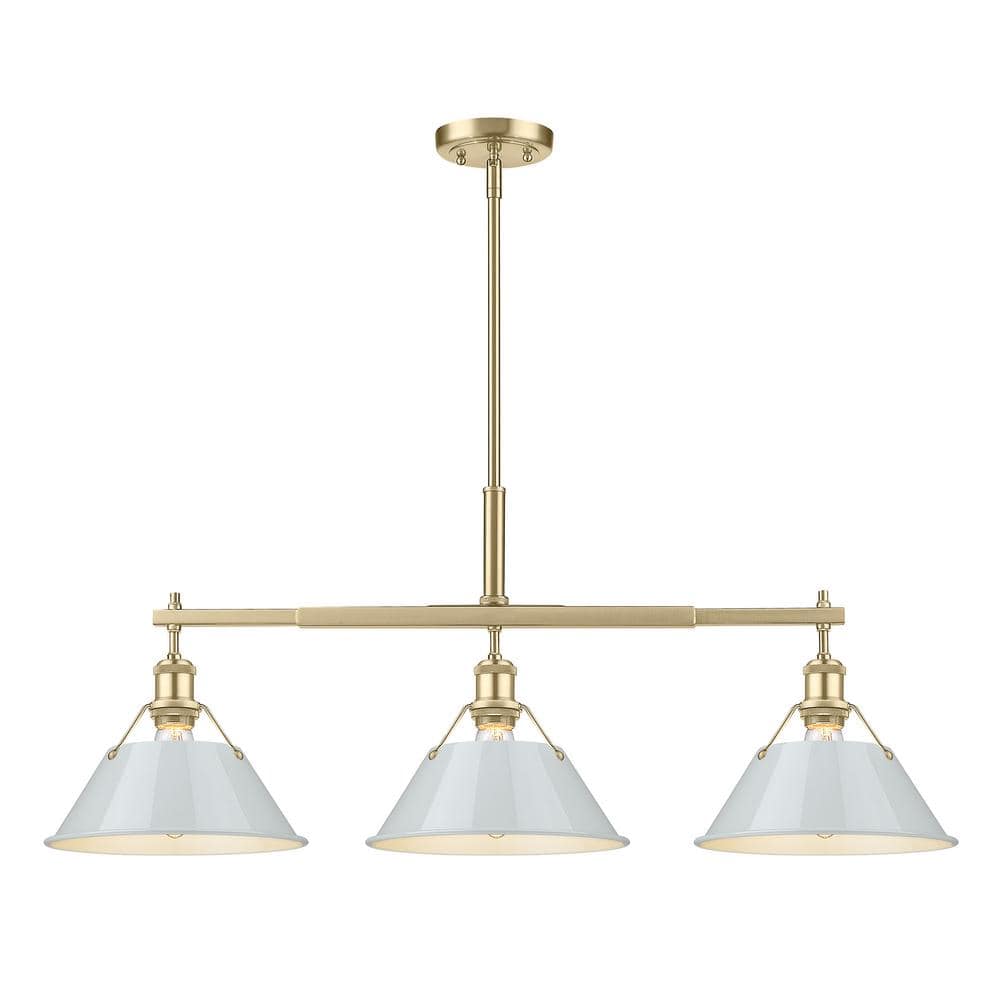 Bring industrial elegance into your home with the Yep by Golden Lighting Orwell 3-light Island Light. Featuring a metal shade in dusky blue and a brushed champagne brass frame, it creates a welcoming atmosphere. The dusky blue shade offers a serene complement to the light, coated with a high-gloss sheen that enhances its smooth surface. The exceptional brushed champagne brass finish provides a sophisticated alternative to traditional gold, delivering a contemporary aesthetic that seamlessly fits modern interiors. Tailored for kitchen islands, this fixture is dry location rated for indoor spaces not subject to moisture, making it a great addition to bedrooms, living rooms, and hallways. It also includes adjustable height options, easily fitting sloped ceilings. Overall dimensions: 35.75"W x 14.5"H x 10"D. Requires 3 E26 medium base bulbs (not included), max 100W each. Enhance your space with the unique style and quality craftsmanship of Yep by Golden Lighting.