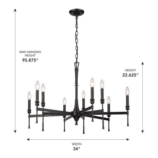 Upgrade your space with the Landon 9-light Chandelier in Matte Black. This modern chandelier combines clean lines and a sophisticated matte black finish, making it perfect for dining rooms, foyers, and more. Dry location rated for safe indoor use. Adjustable height and sloped-ceiling compatible. Requires 9 E12 candelabra bulbs (not included). Dimensions: 34"W x 22.63"H x 34"D.