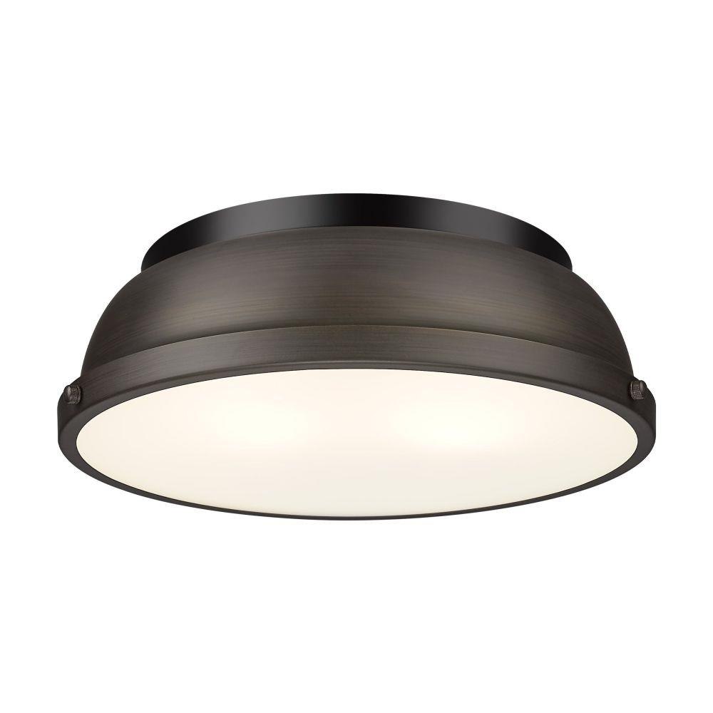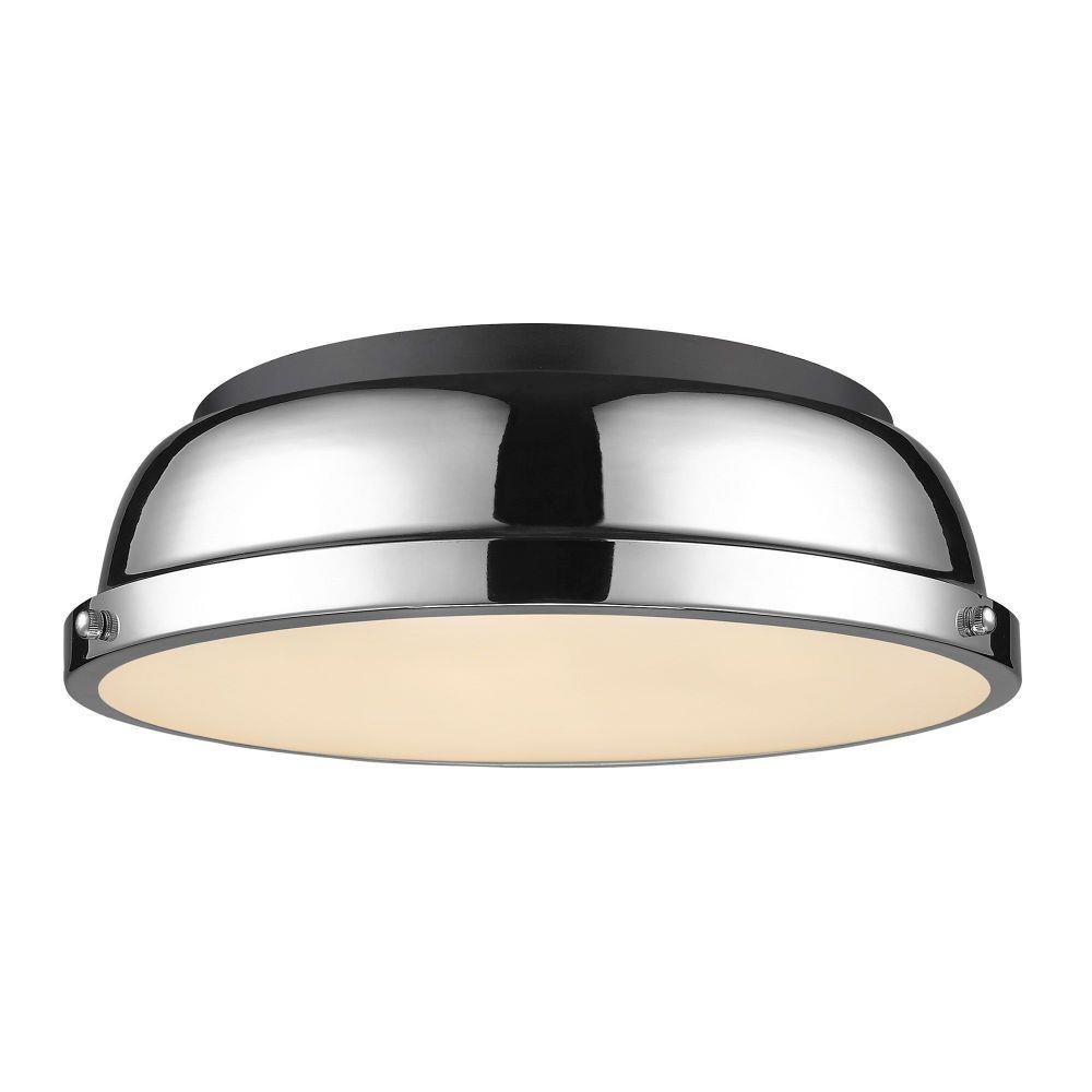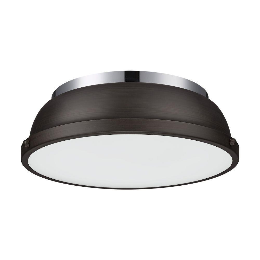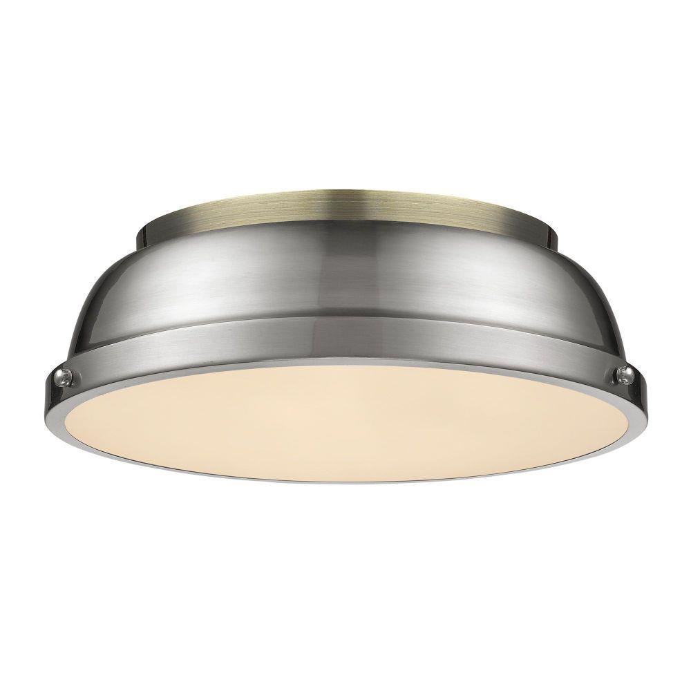 Transform the look of your room with this classic, vintage-inspired fixture by Golden Lighting. Golden Lighting's Duncan collection is contemporary style with an industrial feel. The collection features a variety of simple, traditional silhouettes that are a nod to a bygone era. A variety of plated and painted metal shade finishes are bra offered in combination with durable Aged Brass, Black, Chrome or Pewter fixture bodies. The Rubbed Bronze fixtures are paired with Rubbed Bronze shades. This flush mount is perfect for modern or contemporary style home decors. It works perfectly in a kitchen, hallway or bath and is UL approved for damp locations. This aged brass flush mount is paired with a chrome shade. The shade is a glossy, reflective metallic.