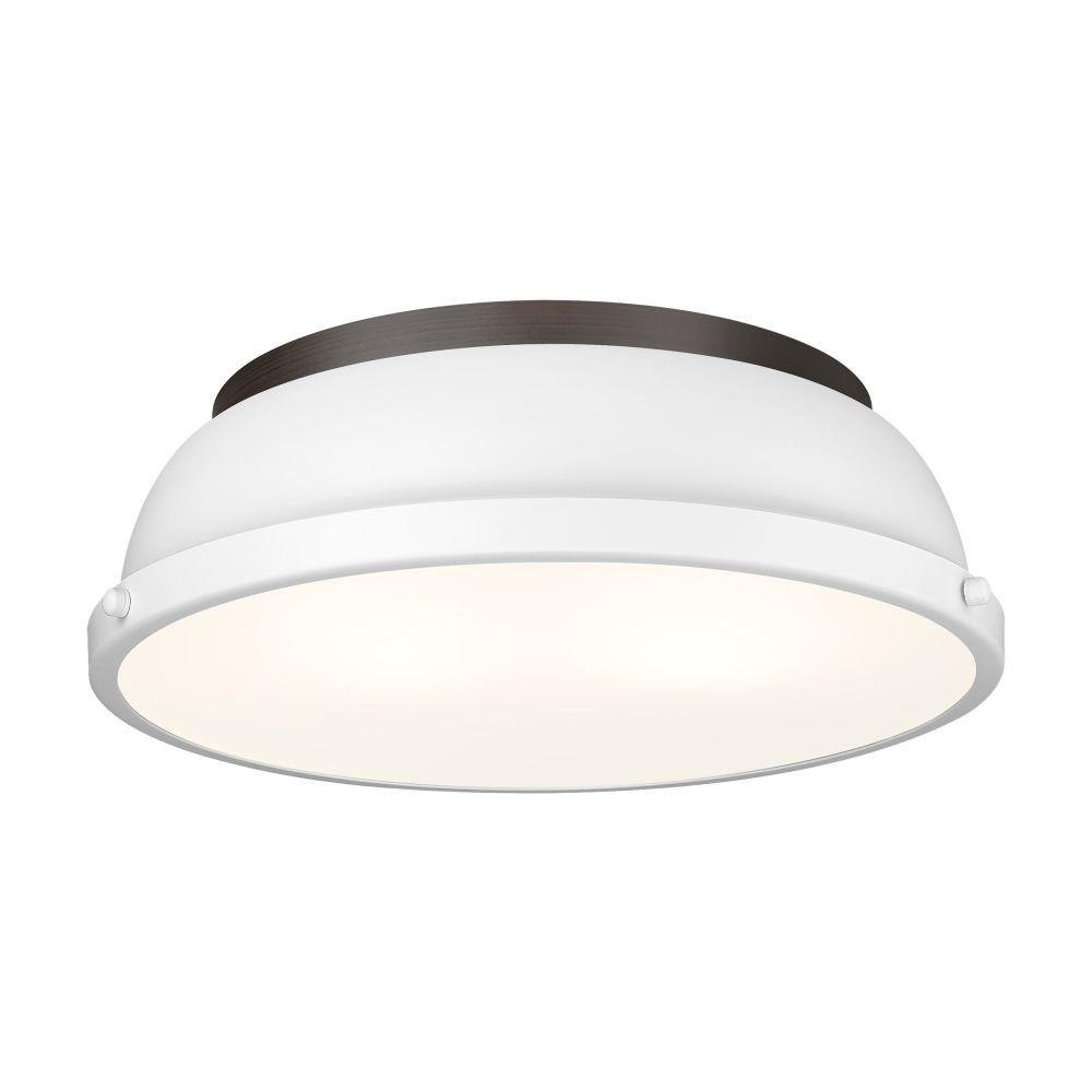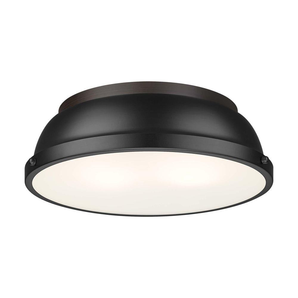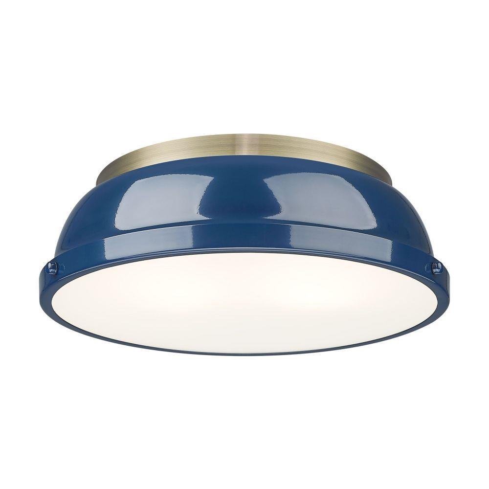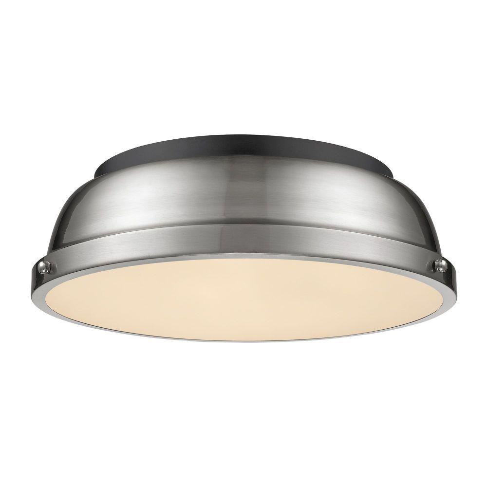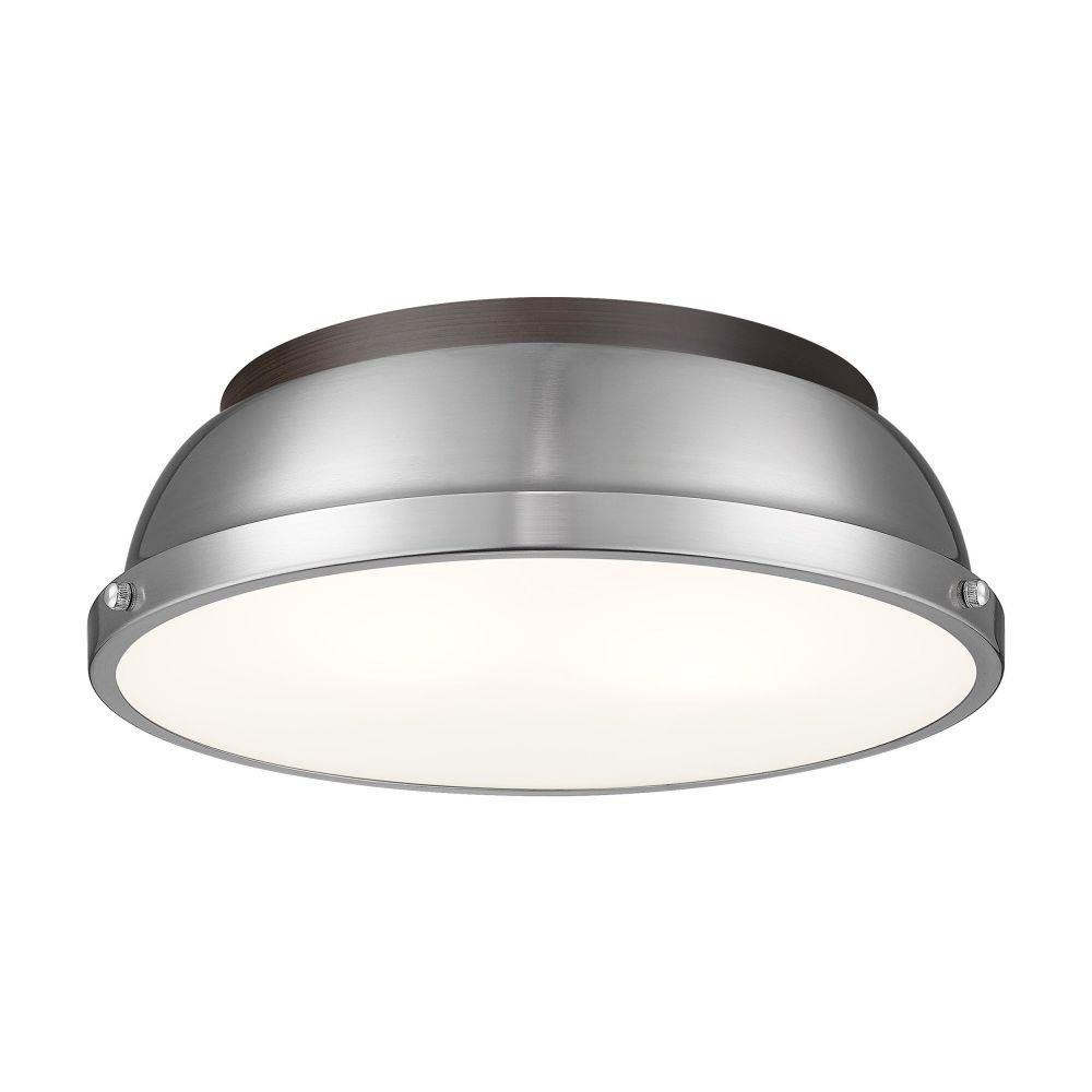 Transform the look of your room with this classic, vintage-inspired fixture by Golden Lighting. Golden Lighting's Duncan collection is contemporary style with an industrial feel. The collection features a variety of simple, traditional silhouettes that are a nod to a bygone era. A variety of plated and painted metal shade finishes are bra offered in combination with durable Aged Brass, Black, Chrome or Pewter fixture bodies. The Rubbed Bronze fixtures are paired with Rubbed Bronze shades. This flush mount is perfect for modern or contemporary style home decors. It works perfectly in a kitchen, hallway or bath and is UL approved for damp locations. This aged brass flush mount is paired with a chrome shade. The shade is a glossy, reflective metallic.