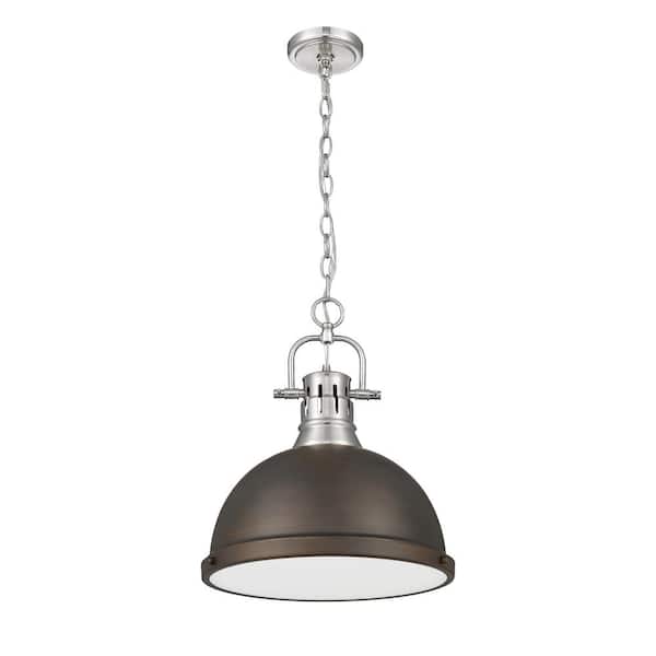 The Duncan collection is contemporary style with an industrial feel. The collection features a variety of simple, traditional silhouettes that are a nod to a bygone era. Transform the look of your room with these classic, vintage-inspired fixtures. A variety of plated and painted metal shade finishes are offered in choice combinations. This large, chain-hung pendant features a glass diffuser and is comfortably sized for a small nook or island. The pendant may be hung individually or grouped over a bar.