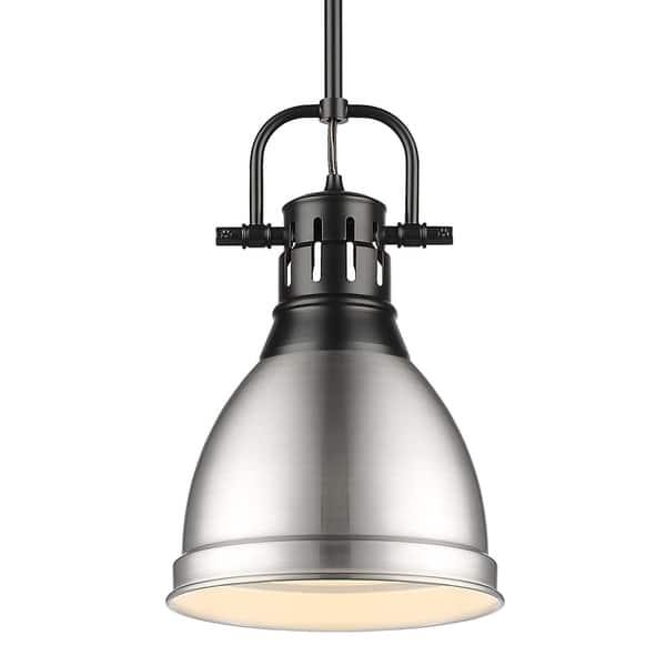 Transform the look of your room with this classic, vintage-inspired fixture by Golden Lighting. Golden Lighting's Duncan collection is contemporary style with an industrial feel. The collection features a variety of simple, traditional silhouettes that are a nod to a bygone era. A variety of plated and painted metal shade finishes are offered in combination with durable Aged Brass, Black, Chrome or Pewter fixture bodies. The Rubbed Bronze fixtures are paired with Rubbed Bronze shades. This small, rod-hung pendant features a may be hung individually or grouped over a bar. This aged brass small pendant with rod is paired with a chrome shade. The shade is a shiny, reflective metallic.