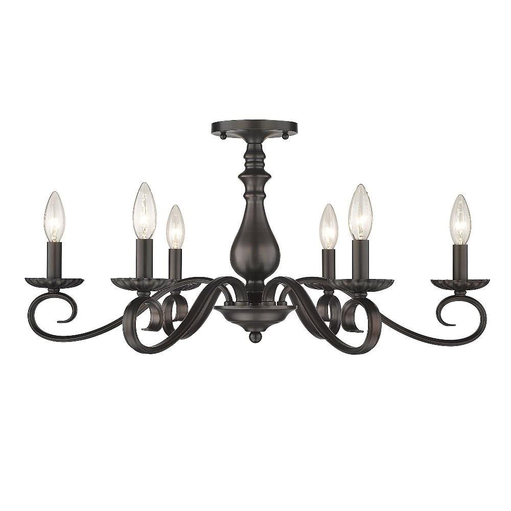 Conventional style in a compact design, Larrick is a decorative option for large spaces with low ceilings. This multi-light semi-flush chandelier has a low profile with wide arms for widespread illumination. Finished in Rubbed Bronze, the turned center column and decorative canopy reinforce the boldly traditional look of curved arms, wide cups, and candelabras. Hang this oversized, close-to-ceiling fixture in traditional to transitional rooms.