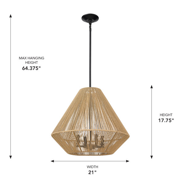 For spaces that could use a glow but perhaps can’t accommodate a chandelier, a pendant light is the perfect middle ground between a flush mount and chandelier. This 4-light geometric pendant hangs from an adjustable length of metal downrod with a black matte finish. Its angular shade is made from handwoven natural raphia rope and houses four 100W bulbs (sold separately) inside. This sloped ceiling-compatible pendant is compatible with dimmer switches and safe to use in damp locations.