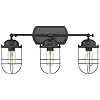 Nautical-inspired, Seaport is a collection of industrial fixtures to create your seaside retreat. Offered in pewter and matte black, the New England style is enhanced by protective cages that shield the otherwise exposed bulbs. Created to suit the needs of many, ball joints permit a multitude of configurations. Point all of the metal shades down for directional task lighting or angle them out to fit a low ceiling or tight space. This 3-light bath vanity is damp rated and may be mounted on the wall or ceiling.
