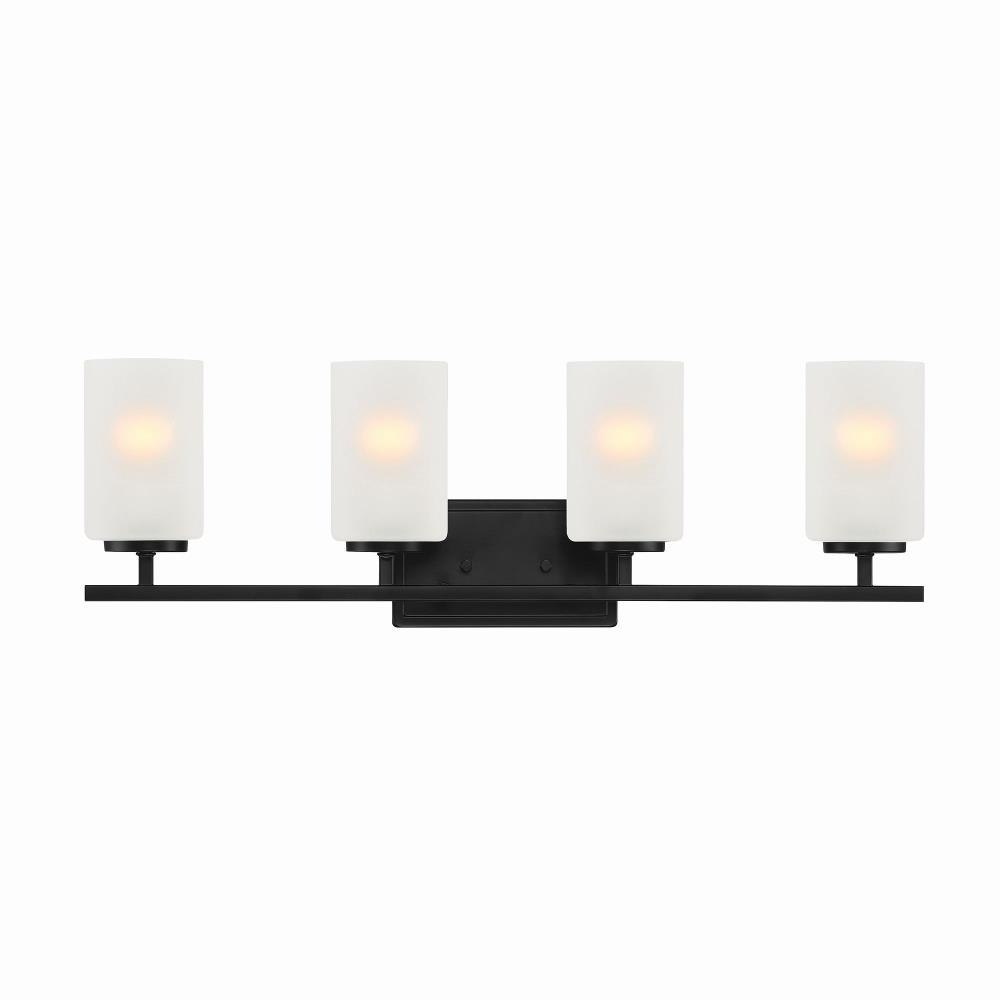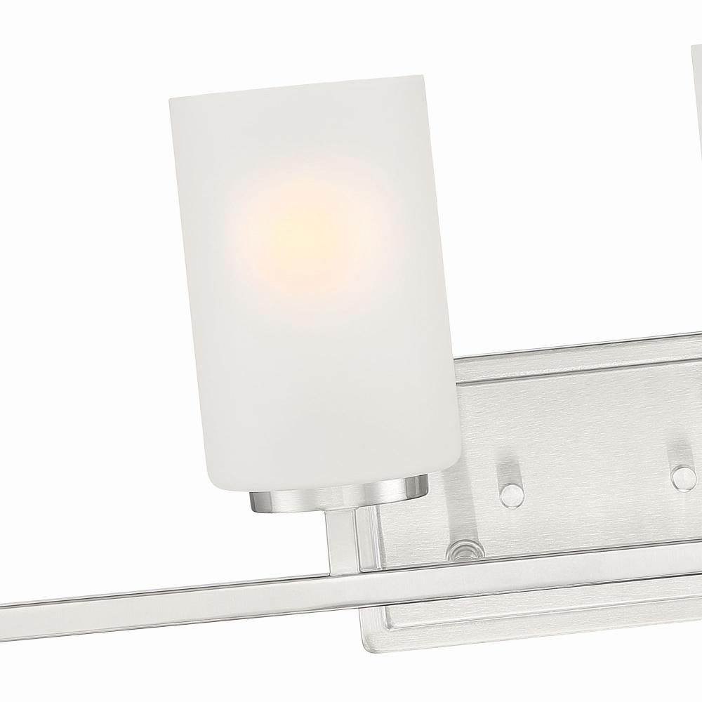 Simple lines and etched rounded shapes contrast perfectively with the bold black or sleek metallic finishes of our Carmine collection. This minimalistic style adds a fresh aesthetic with a softer and more relaxed approach to todays Modern interiors.Brushed Nickel 4 Light Vanity with etched glass is part of the Carmine collectionRequires (4) medium based light bulbs - 60-Watts or less each (not included)Fixture dimension: 28-in W 9-in H 5.5-in D Damp location ratedUL listed, 1-year warrantyDimmable with a dimmer switchMounting hardware is included for an easy installation.