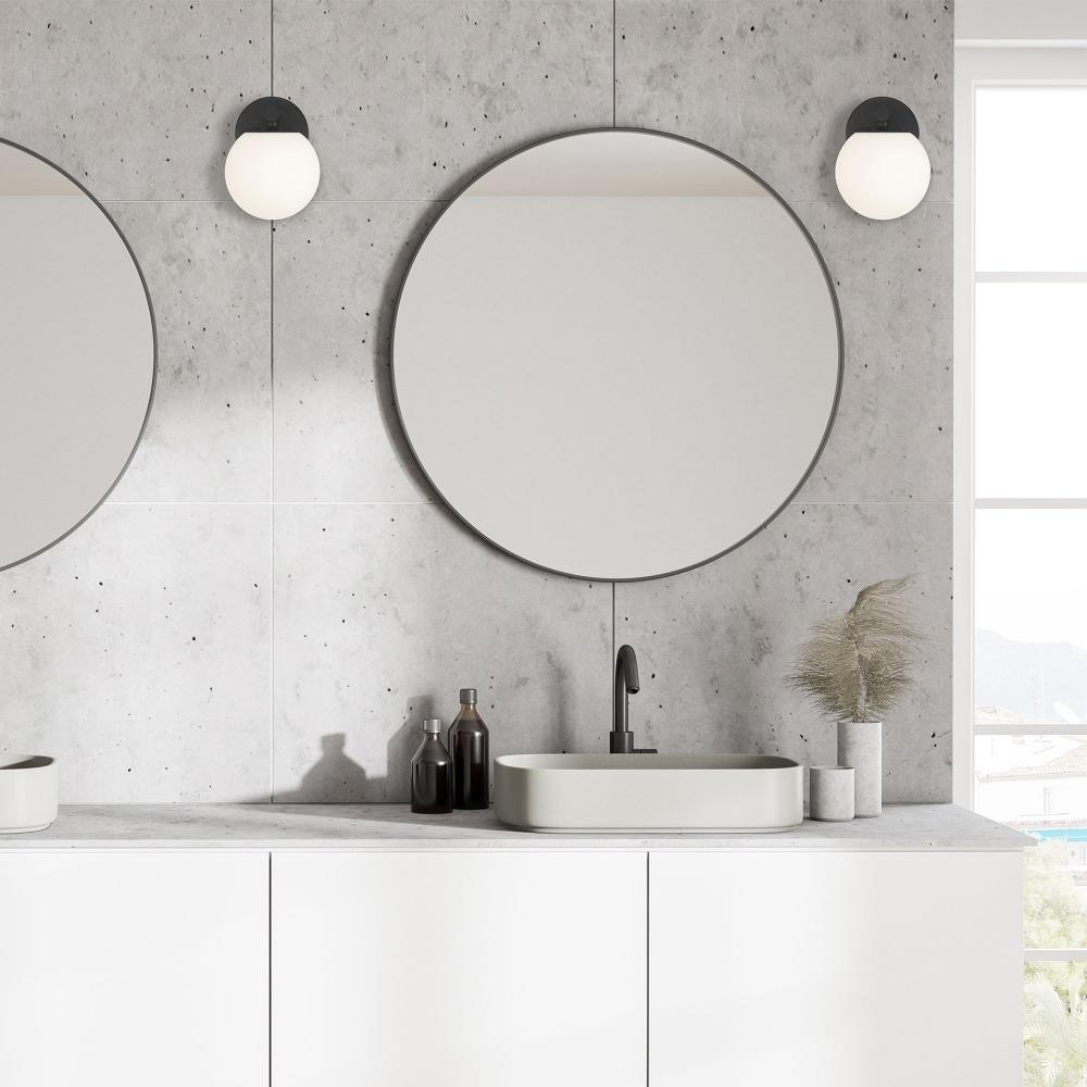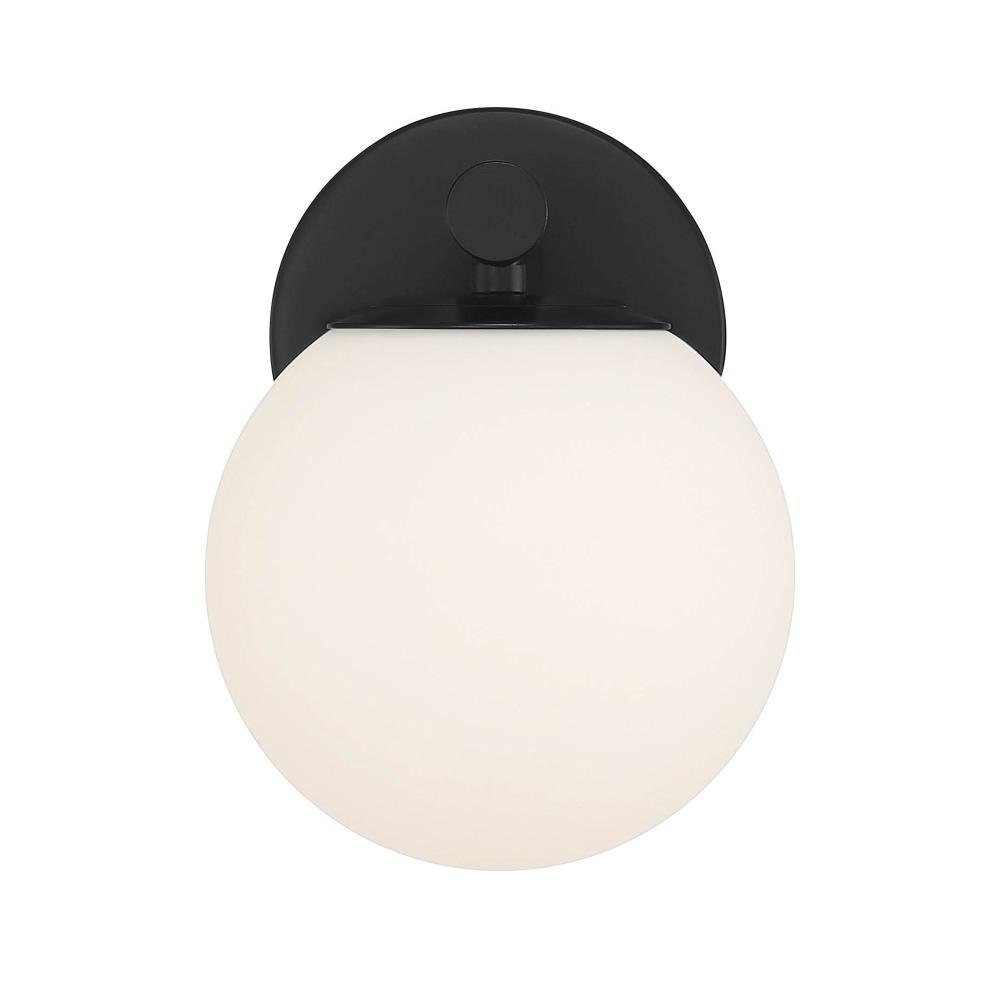 The globe-shaped shades and cylindrical arms of the Crown Heights collection provide a simple elegance and a modern touch to your home. The sleek matte black finish is flexible enough to work within any interior design. Made from durable steel for years of enjoyment and illumination.Sleek Matte Black finish goes well with nearly any decor Extends 7 inches from the wallCan be mounted with shade facing up or downUses 1 candelabra-base 60W max bulb (not included)Etched opal glass shade for soft, diffuse lightRated for Dry or Damp indoor areasModern wall sconce is great for hallways, entryways, bathrooms, bedrooms, or any other rooms where you need a little extra light.