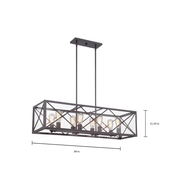 Illuminate your dining space in curated industrial style with this eight-light kitchen island pendant. Measuring 13.5'' H x 39'' W x 12'' D overall, the frame strikes a rectangular silhouette crafted of clean-lined metal bars in a rich, satin bronze finish. Within, a series of pipe arms prop up streamlined cylindrical sockets to accommodate 60 W Edison bulbs (not included), while clear glass panels diffuse bright light throughout your space, and X-shaped overlays provide architectural detail. Two adjustable-length downrods suspend the unit from a matching canopy above to round out the design.
