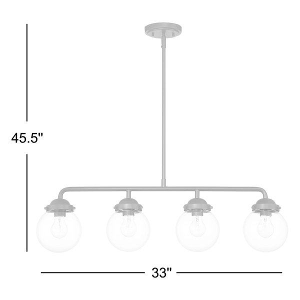 This 4-light pendant makes a statement in your kitchen or dining room with its gleaming frame and linear design. It's crafted from hand-forged stainless steel, and it features a row of four lights suspended from a single height-adjustable downrod. Clear glass globes surround each 60W bulb (sold separately) for a polished look full of vintage charm. This hard-wired fixture works with a dimmer switch, so it lets you set the mood just how you want it. Plus, it's compatible with sloped ceilings, so it fits in just about anywhere.