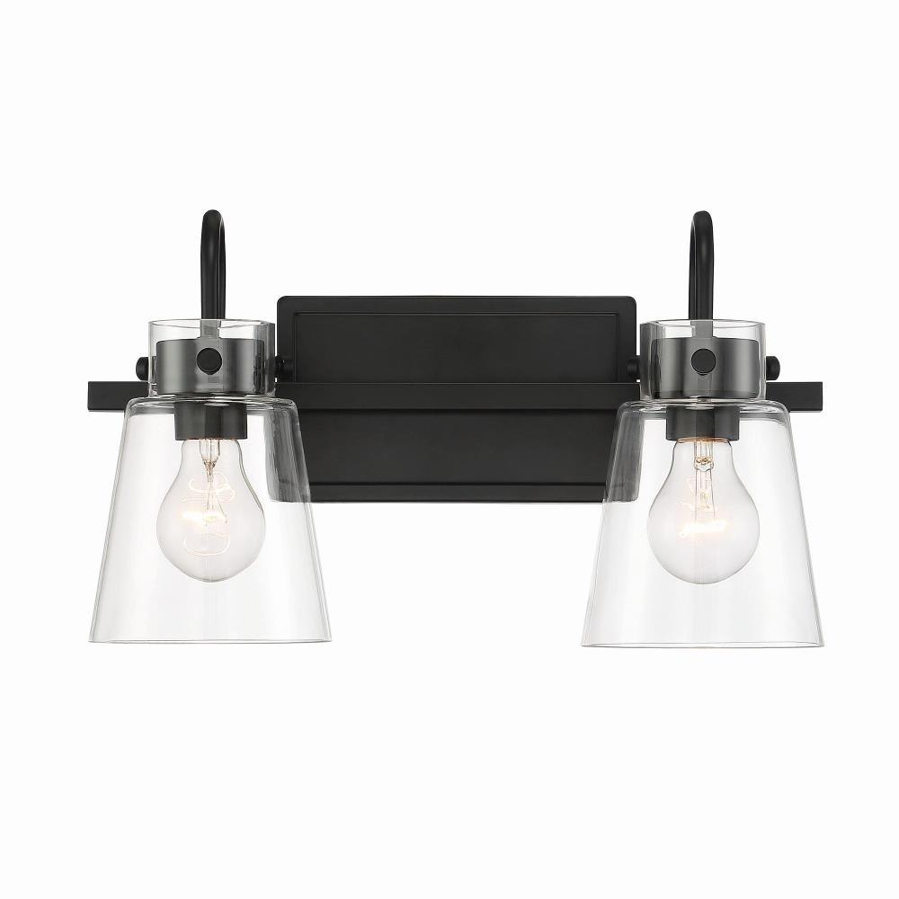 Clean and airy, Inwood offers tapered clear blown glass shades and a brilliant Matte Black finish. Designed with flexibility in mind, the elements are bold but minimal and will blend perfectly to coordinate with a variety of settings. The fixture can be mounted up or down and is easy to install. It requires 4 screw-based light bulbs, ideal for filament style.Matte Black 2 Light Vanity with clear glass shade is part of the Inwood collectionRequires (2) medium based light bulbs - 60-Watts or less each (not included)Fixture dimension: 16-in W 9.25-in H 6.75-in D Damp location ratedUL listed, 1-year warrantyDimmable with a dimmer switchMounting hardware is included for an easy installation.