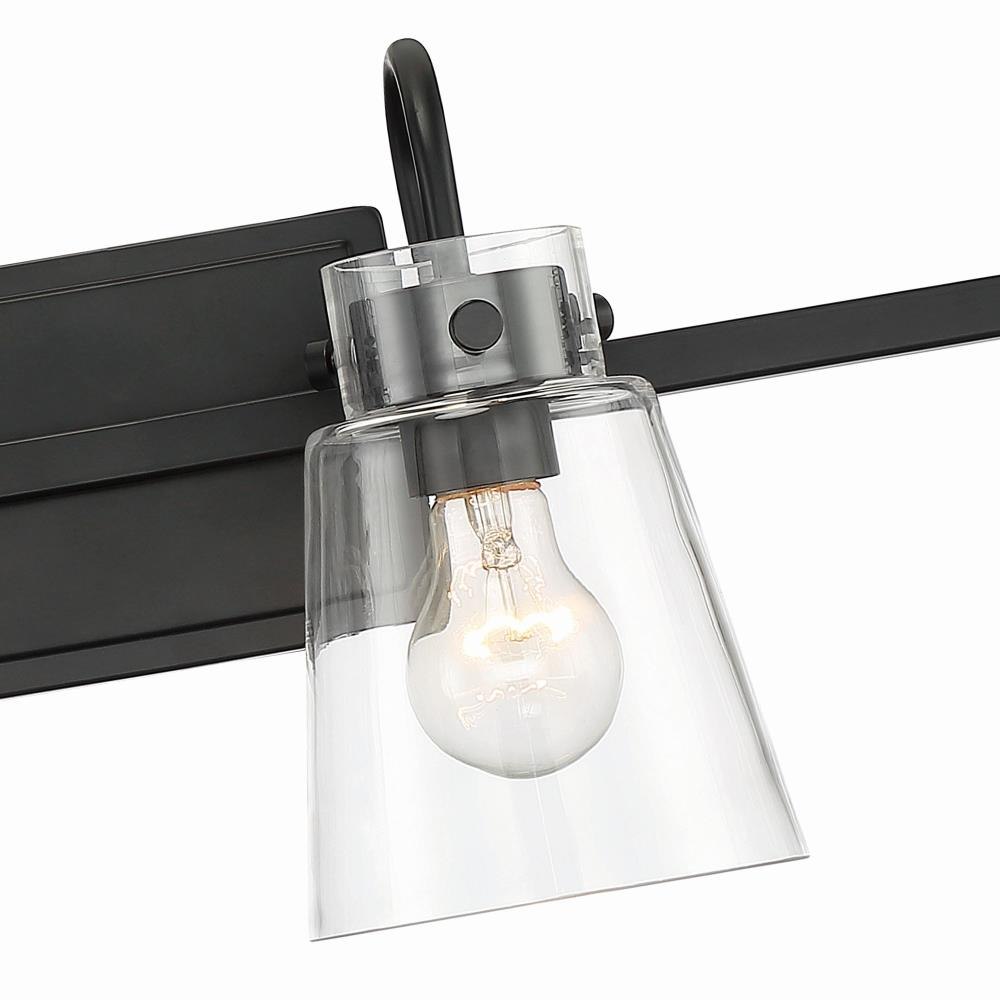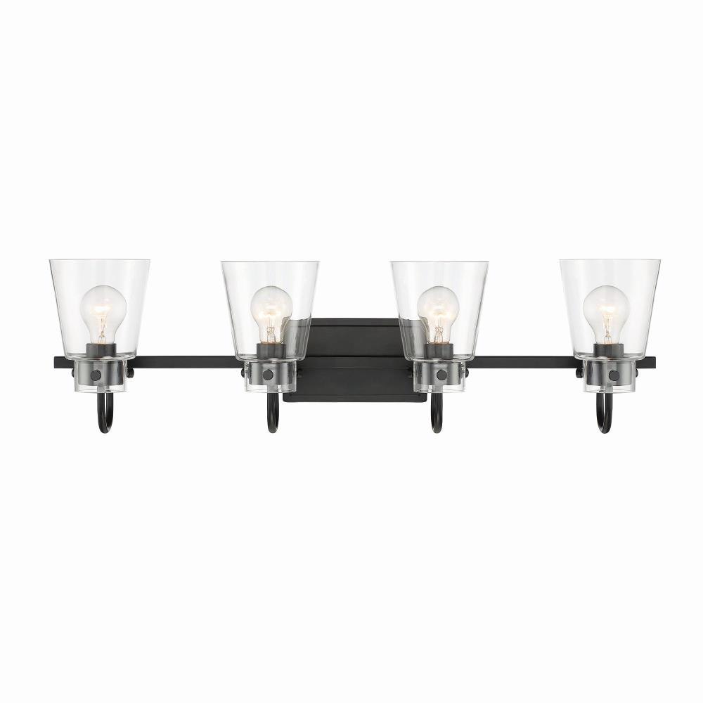 Clean and airy, Inwood offers tapered clear blown glass shades and a brilliant Matte Black finish. Designed with flexibility in mind, the elements are bold but minimal and will blend perfectly to coordinate with a variety of settings. The fixture can be mounted up or down and is easy to install. It requires 4 screw-based light bulbs, ideal for filament style.Matte Black 4 Light Vanity with clear glass shade is part of the Inwood collectionRequires (4) medium based light bulbs - 60-Watts or less each (not included)Fixture dimension: 32-in W 9.25-in H 6.75-in D Damp location ratedUL listed, 1-year warrantyDimmable with a dimmer switchMounting hardware is included for an easy installation.
