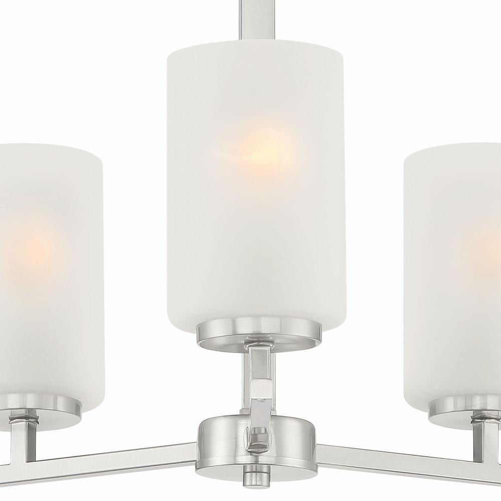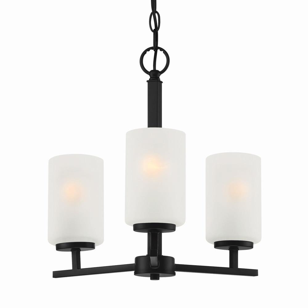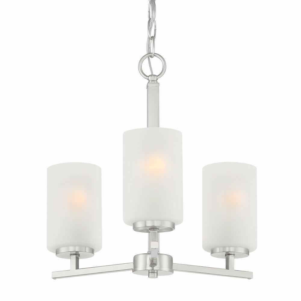 Simple lines and etched rounded shapes contrast perfectively with the bold black or sleek metallic finishes of our Carmine collection. This minimalistic style adds a fresh aesthetic with a softer and more relaxed approach to todays Modern interiors.Brushed Nickel 3 Light Chandelier with etched glass is part of the Carmine collectionRequires (3) medium based light bulbs - 60-Watts or less each (not included)Fixture dimension: 16-in W 16-in H Dry location ratedUL listed, 1-year warrantyDimmable with a dimmer switchMounting hardware is included for an easy installation.