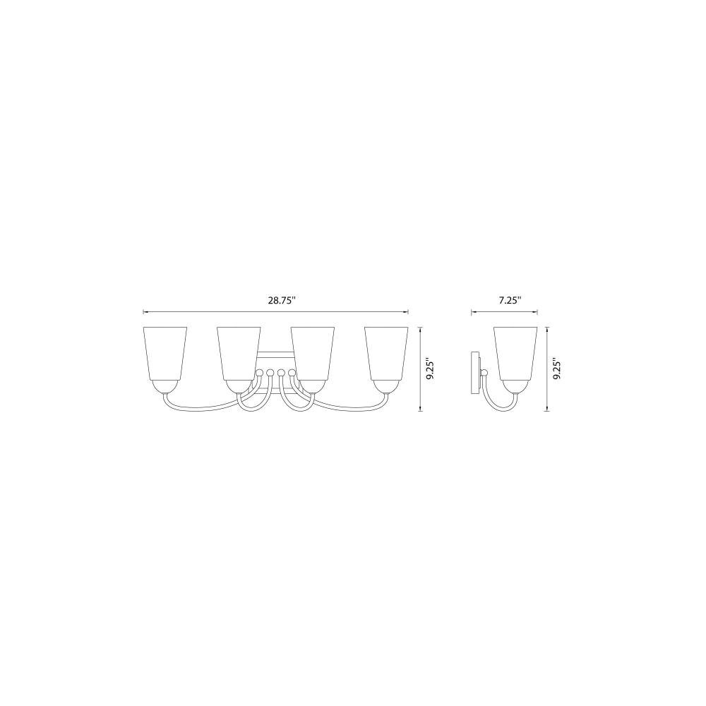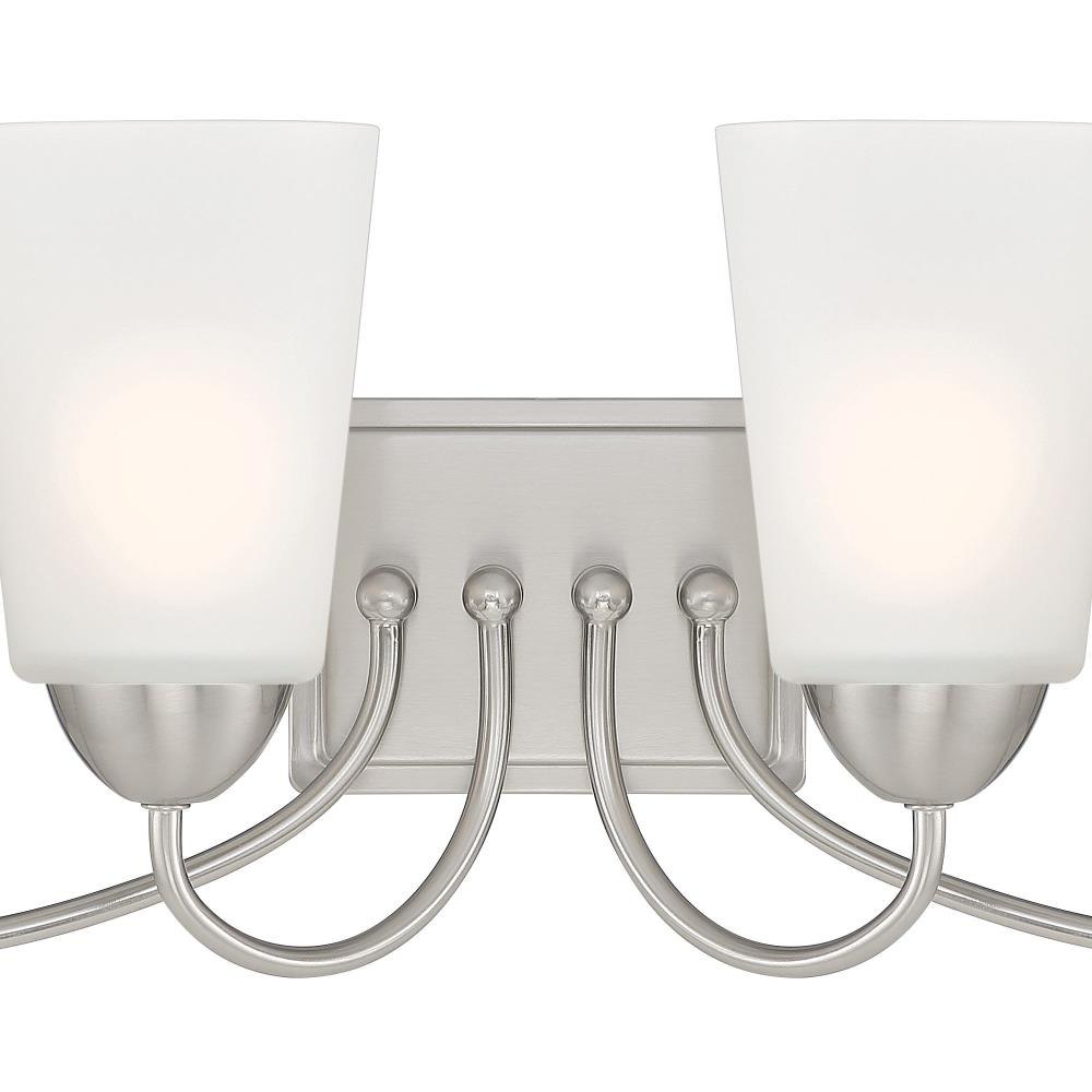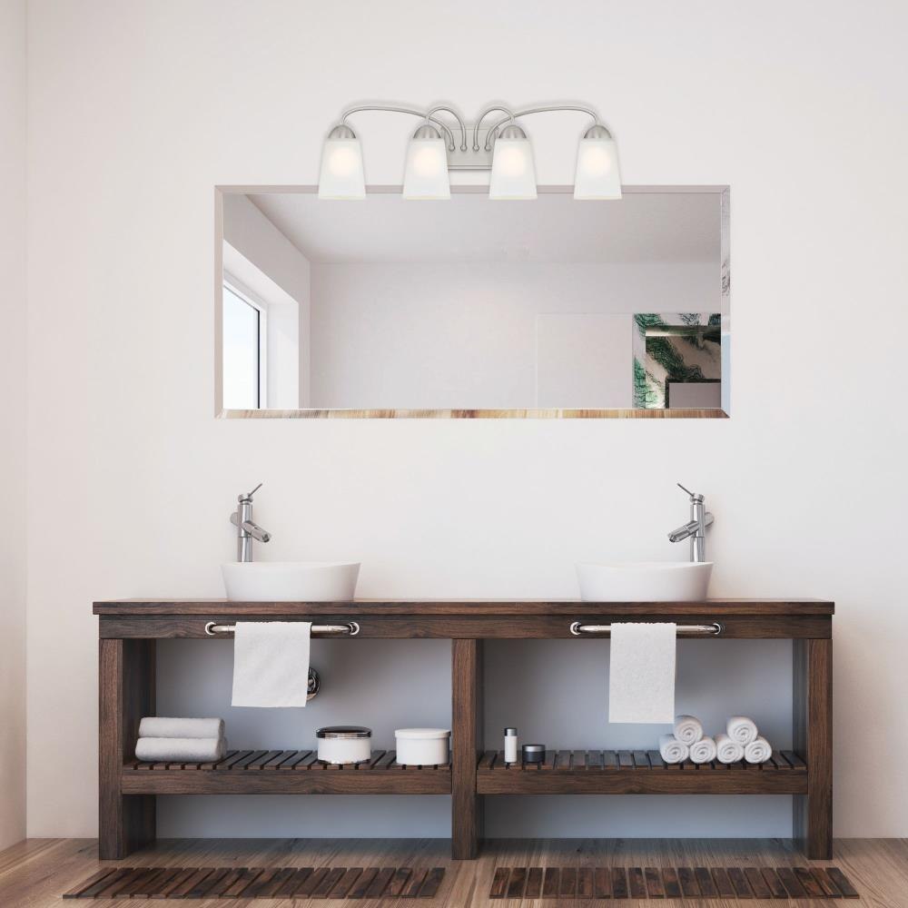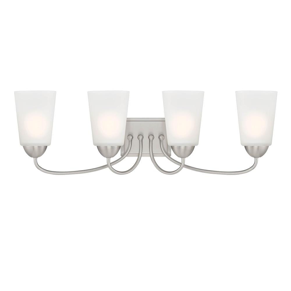 The simple curved lines of the Malone collection combine Modern and Traditional sensibilities into an overall Transitional design. Available in Matte Black or Brushed Nickel and a large variety of fixture types, you’ll be sure to find the piece you’re looking for. Made from durable steel for years of enjoyment and illumination.Timeless Brushed Nickel finish works well with nearly any décorExtends 7.25 inches from the wallCan be mounted with shades facing up or downUses 4 medium-base 60W max bulbs (not included)Frosted glass shades for soft, diffuse lightRated for Dry or Damp indoor areasTransitional vanity is great for bathrooms, bedrooms, or other rooms where you need a extra light.