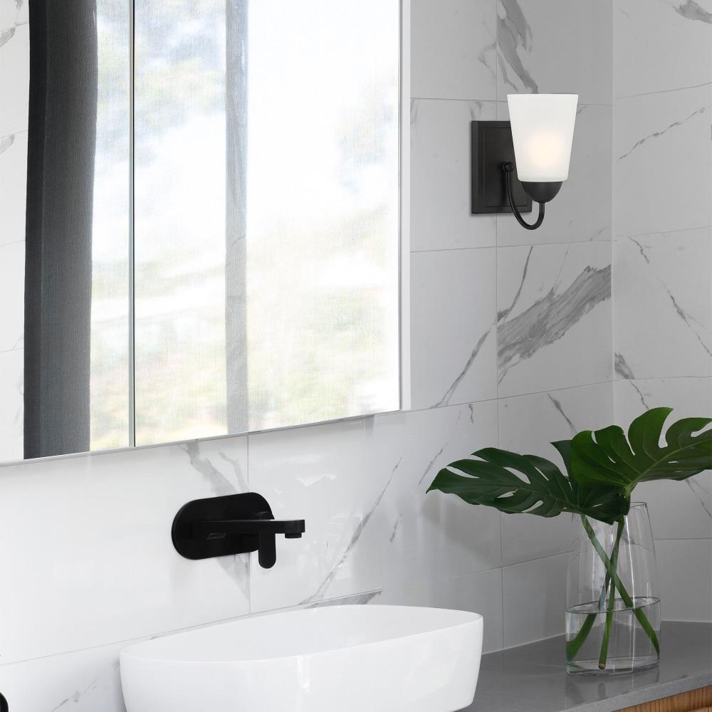 The simple curved lines of the Malone collection combine Modern and Traditional sensibilities into an overall Transitional design. Available in Matte Black or Brushed Nickel and a large variety of fixture types, you’ll be sure to find the piece you’re looking for. Made from durable steel for years of enjoyment and illumination.Timeless Brushed Nickel finish works well with nearly any décorExtends 7.25 inches from the wallCan be mounted with shade facing up or downUses 1 medium-base 60W max bulb (not included)Frosted glass shade for soft, diffuse lightRated for Dry or Damp indoor areasTransitional wall sconce is great for hallways, entryways, bathrooms, bedrooms, or any other rooms where you need a little extra light.