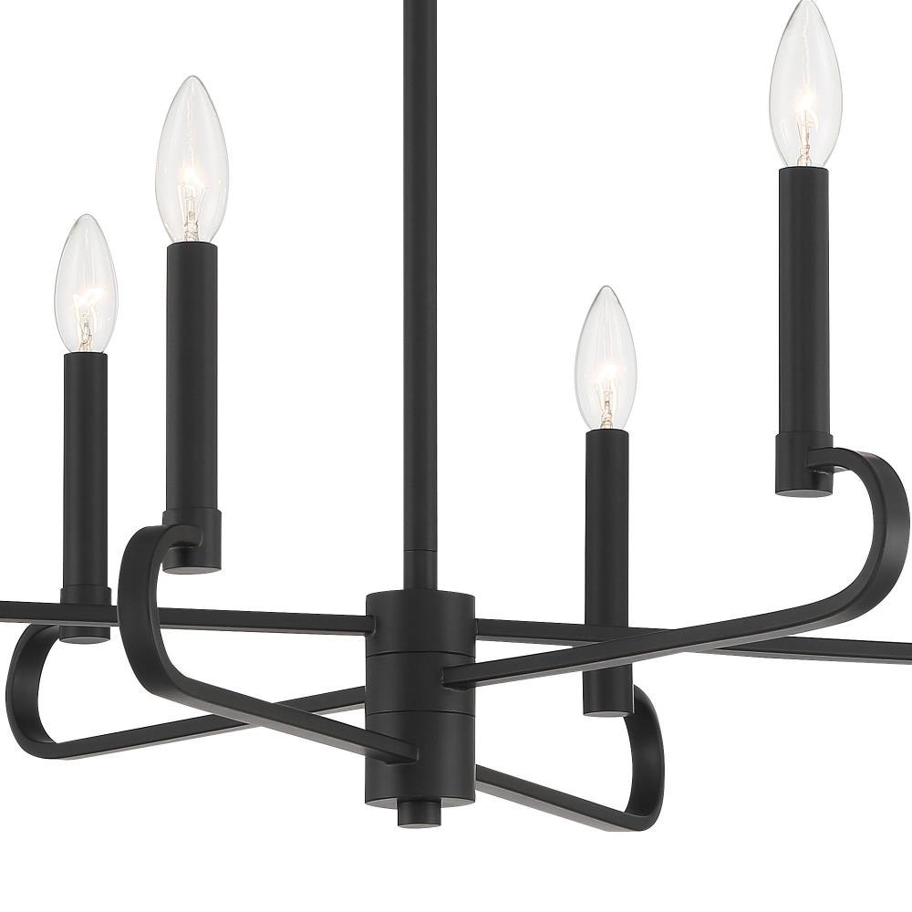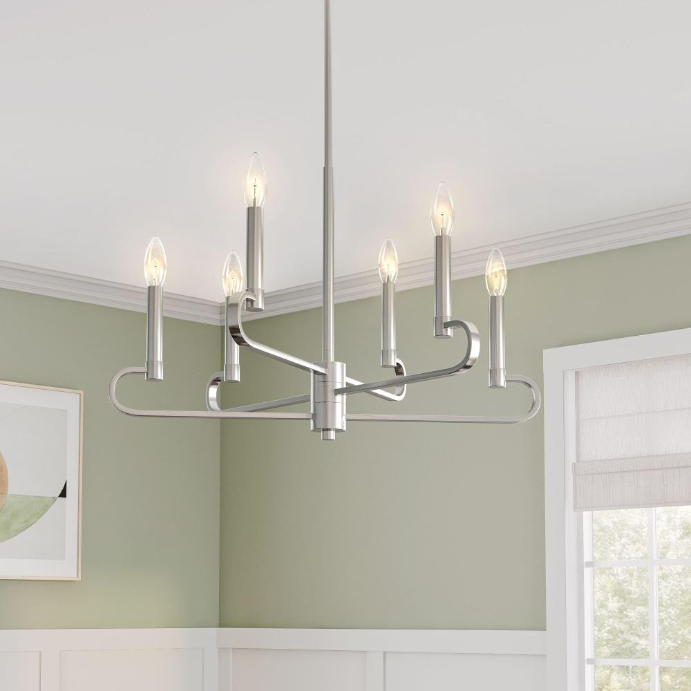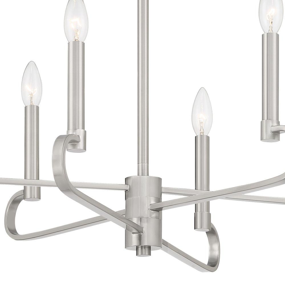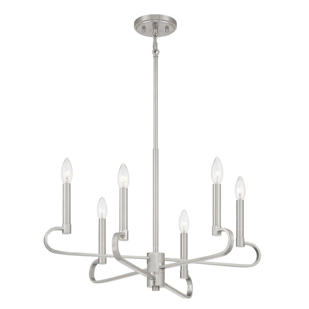 Designers Fountain’s Summit collection combines Modern simplicity and the elegance of candelabra-style curves and bare bulbs. Summit is available in timeless Brushed Nickel or sleek Matte Black. Made from durable steel for years of enjoyment and illumination.Timeless Brushed Nickel finish works well with nearly any décorMax hanging height of 52.75 inches with included rodsChandelier is adjustable for sloped ceilings - up to 45 degreesUses 6 candelabra-base 60W max bulbs (not included)Bare bulb design eliminates the shade and maximuzies illuminationRated for Dry indoor areas onlyTransitional chandelier is great for living rooms, foyers, and large rooms/areas of your home.