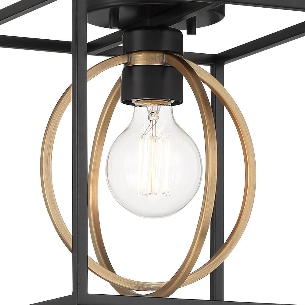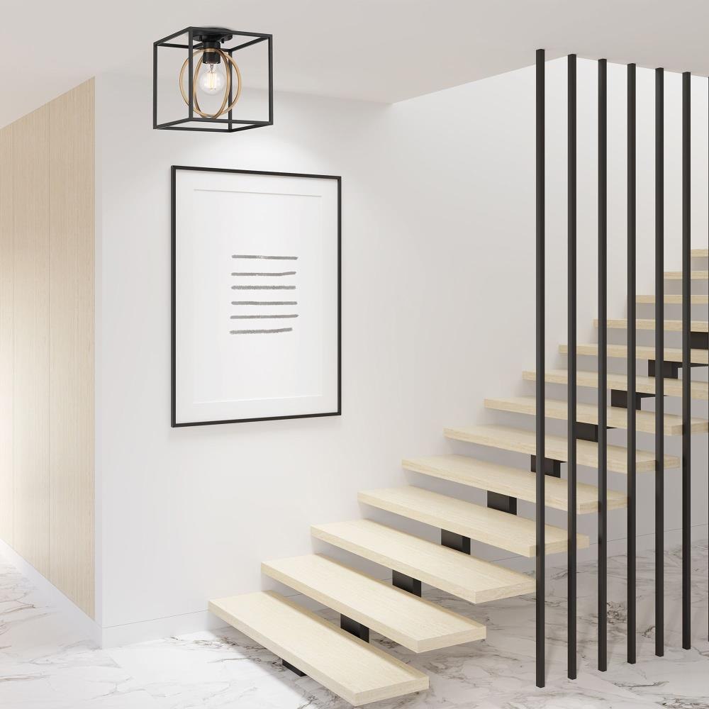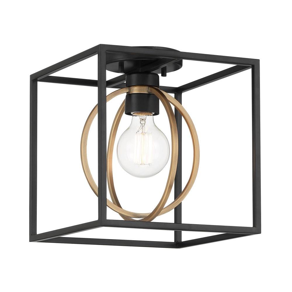 Nested geometric shapes and bold finish combinations are the hallmarks of the Modern Industrial style of Designers Fountain’s Kew Gardens collection. Bare bulbs shine the maximum amount of light on each slender edge and add a dramatic statement piece to any room in your home. Made from durable steel for years of enjoyment and illumination.Matte Black finish and Old Satin Brass accent add to modern decorBare bulb design eliminates the shade and maximuzies illuminationUses 1 medium-base 60W max bulb (not included)Compatible with standard wall dimmerRated for Dry indoor areas onlyModern semi-flush mount light is great for entryways, hallways, bedrooms, and other small/medium-sized rooms in your homeCertified by UL.