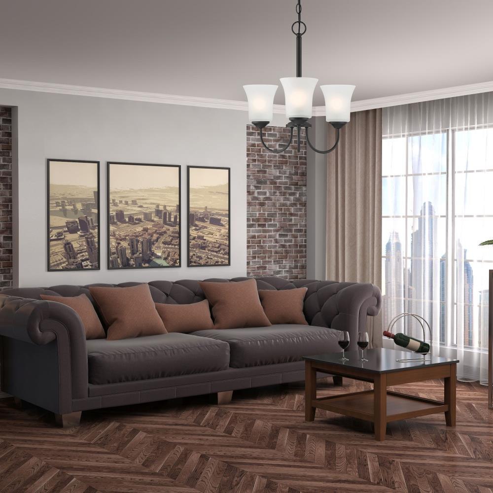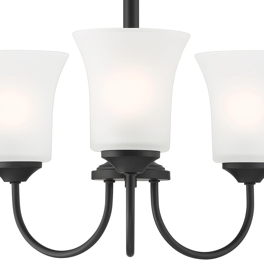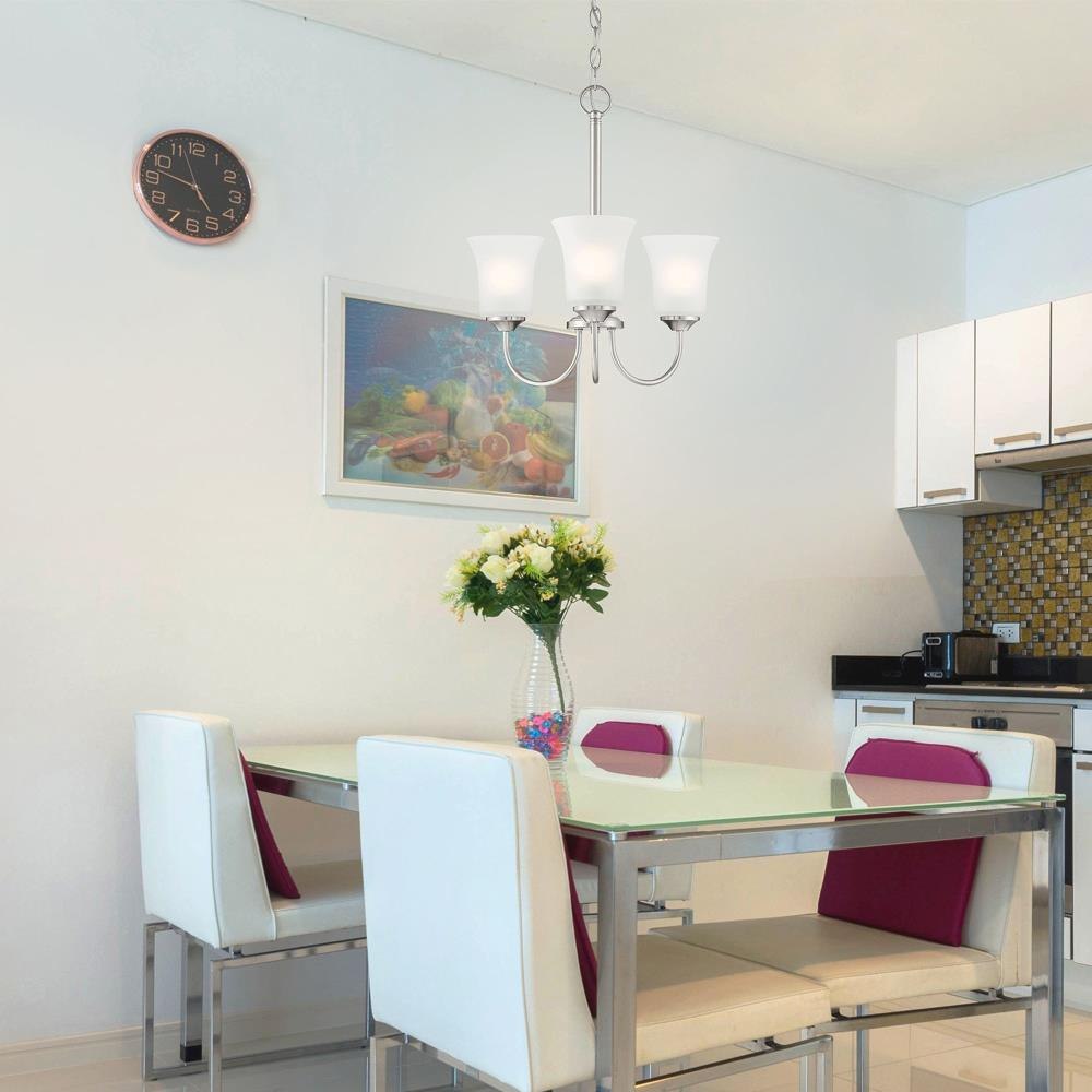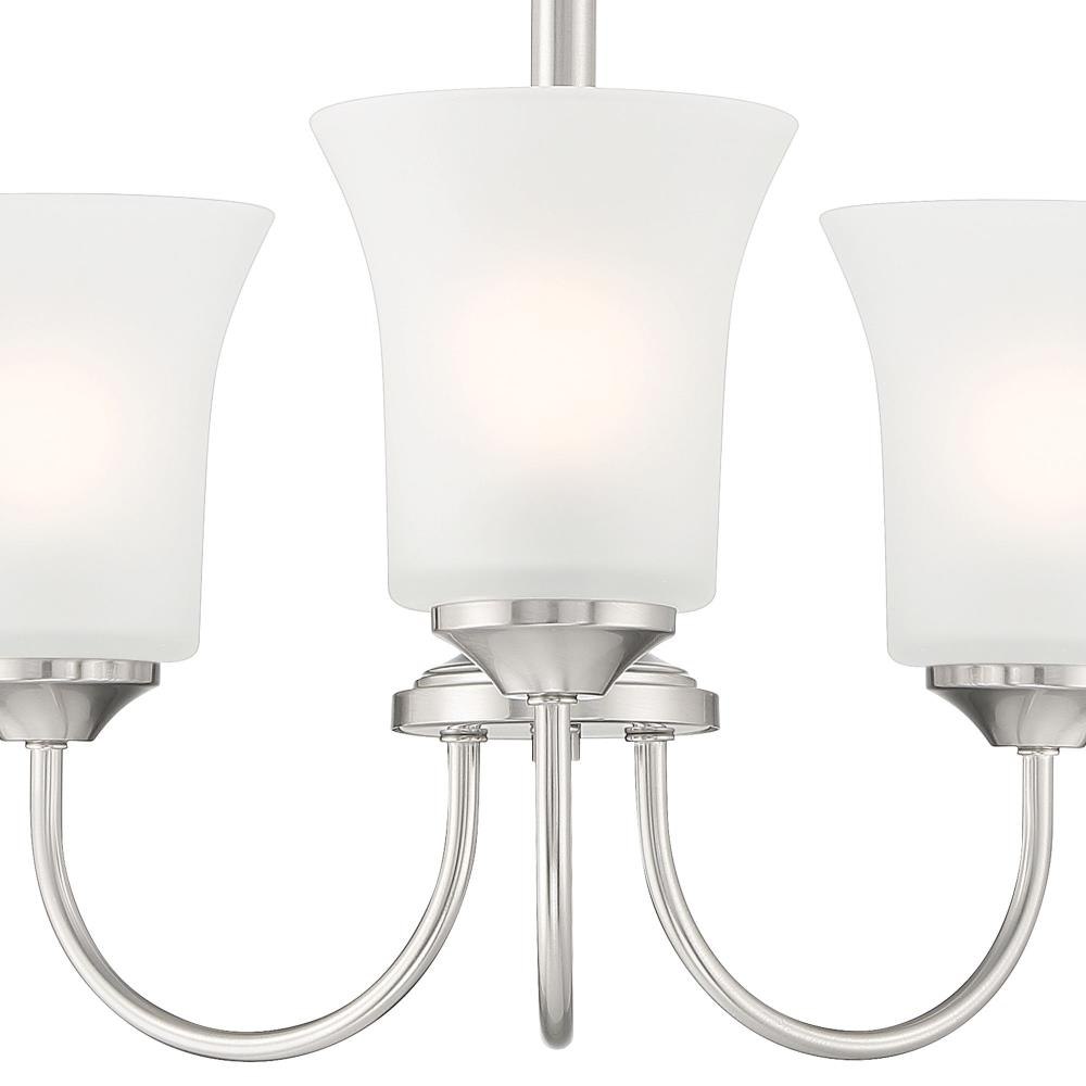 With simple elements and flared Frosted Glass shades, Bronson is a Transitional collection that blends Traditional and Modern styling. It’s available in either Matte Black or Brushed Nickel, and a wide variety of fixture types to suit all of your lighting needs. Made from durable steel for years of enjoyment and illumination.Timeless Brushed Nickel finish works well with nearly any décorMax hanging height of 55.25 inches with included chains and wireChandelier is adjustable for sloped ceilings - up to 45 degreesUses 3 medium-base 60W max bulbs (not included)Frosted glass shades for soft, diffuse lightRated for Dry indoor areas onlyTransitional chandelier is great for living rooms, foyers, and large rooms/areas of your home.