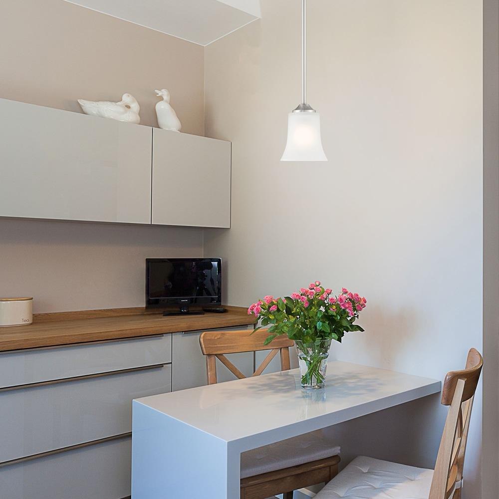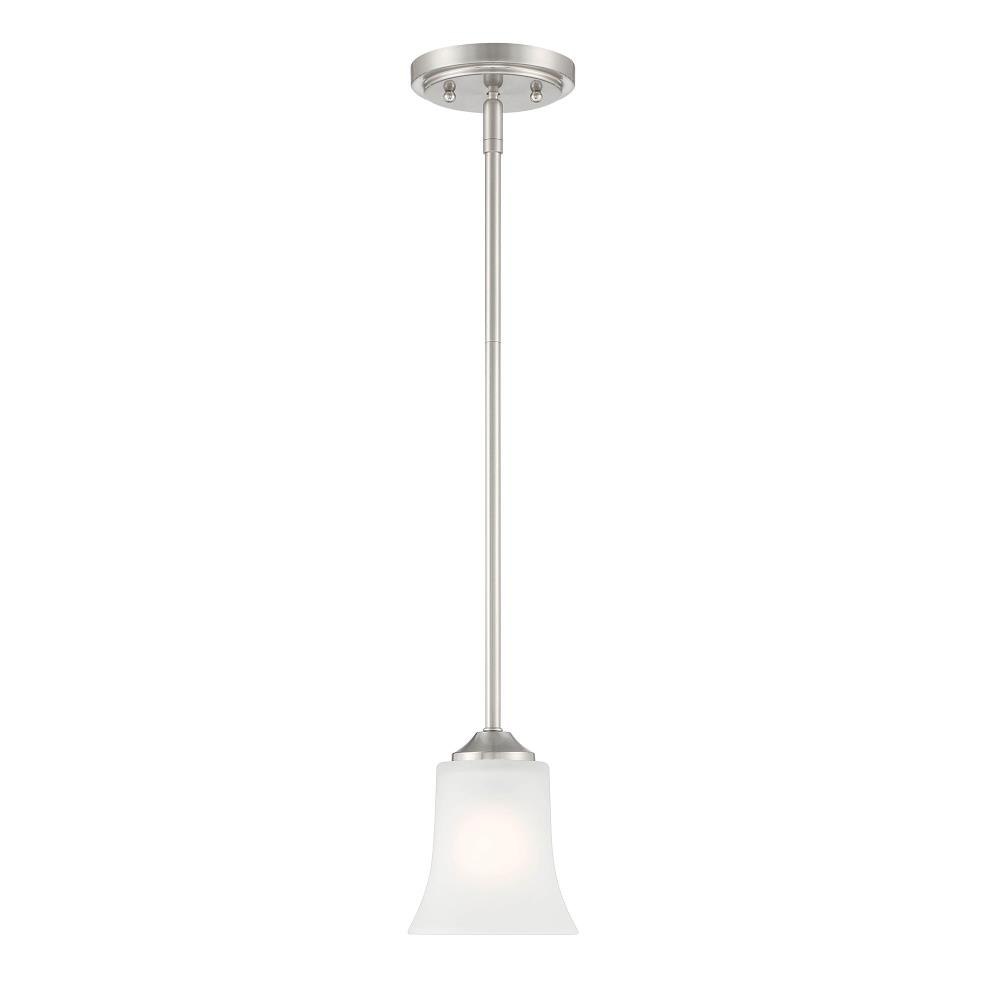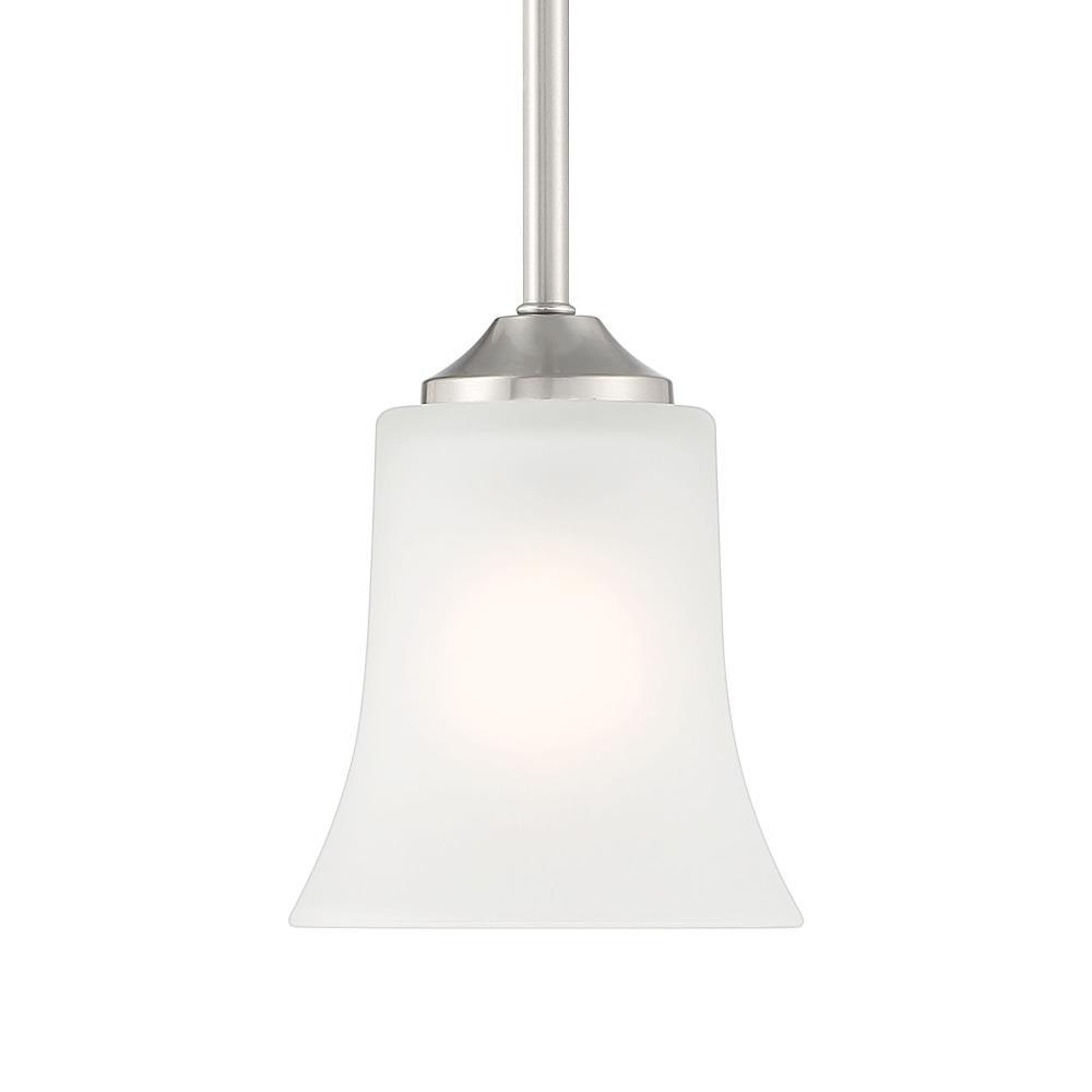 With simple elements and flared Frosted Glass shades, Bronson is a Transitional collection that blends Traditional and Modern styling. It’s available in either Matte Black or Brushed Nickel, and a wide variety of fixture types to suit all of your lighting needs. Made from durable steel for years of enjoyment and illumination.Timeless Brushed Nickel finish works well with nearly any décorMax hanging height of 42.25 inches with included rodsPendant is adjustable for sloped ceilings - up to 45 degreesUses 1 medium-base 60W max bulb (not included)Frosted glass shade for soft, diffuse lightRated for Dry indoor areas onlyTransitional pendant is great for living rooms, foyers, dining areas, and small-to-medium-sized rooms.