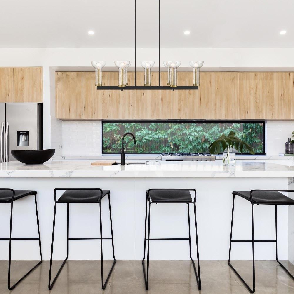 • Modern island light in Matte Black with Clear Seedy Glass shades