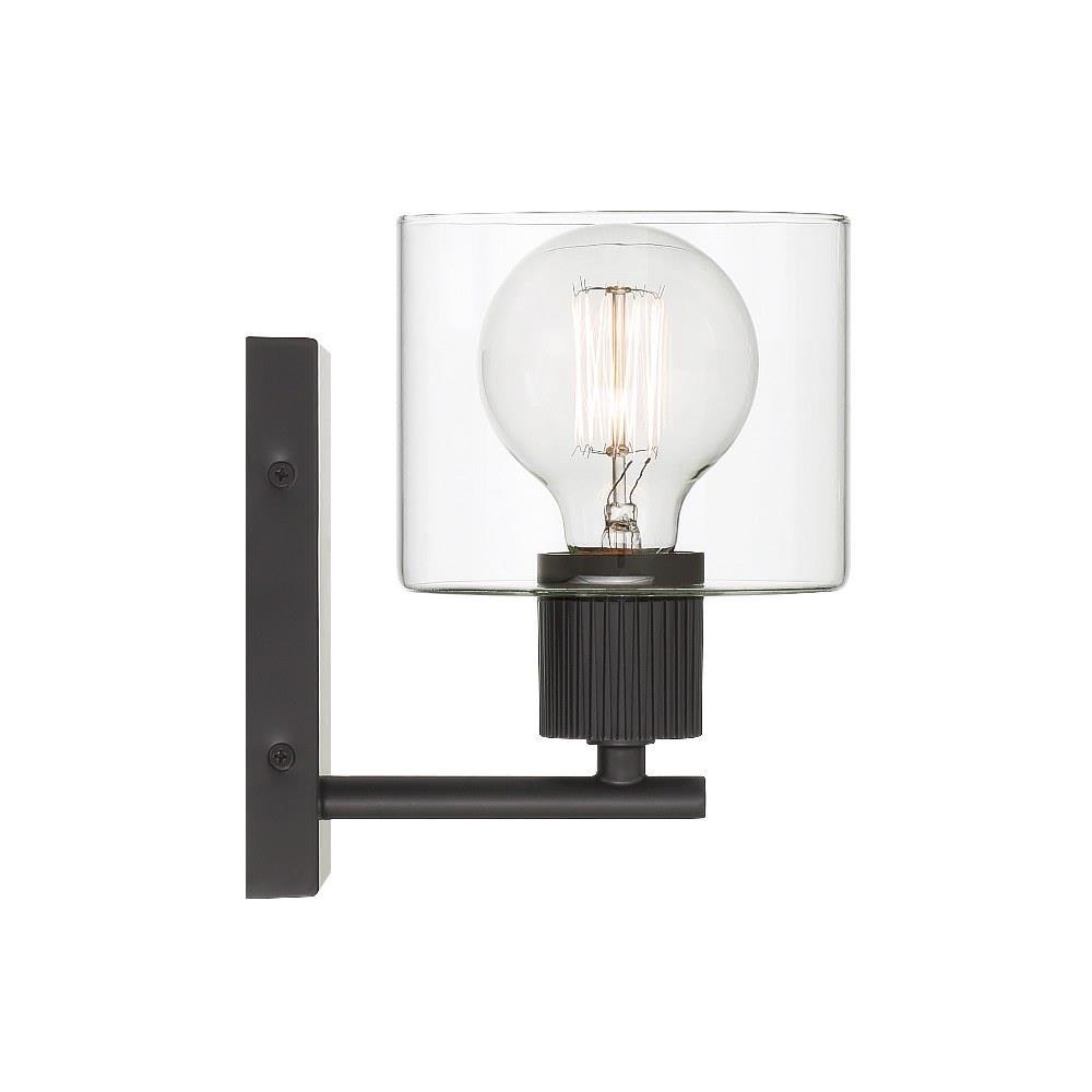 • Transitional wall sconce in Matte Black with a Clear Glass shade