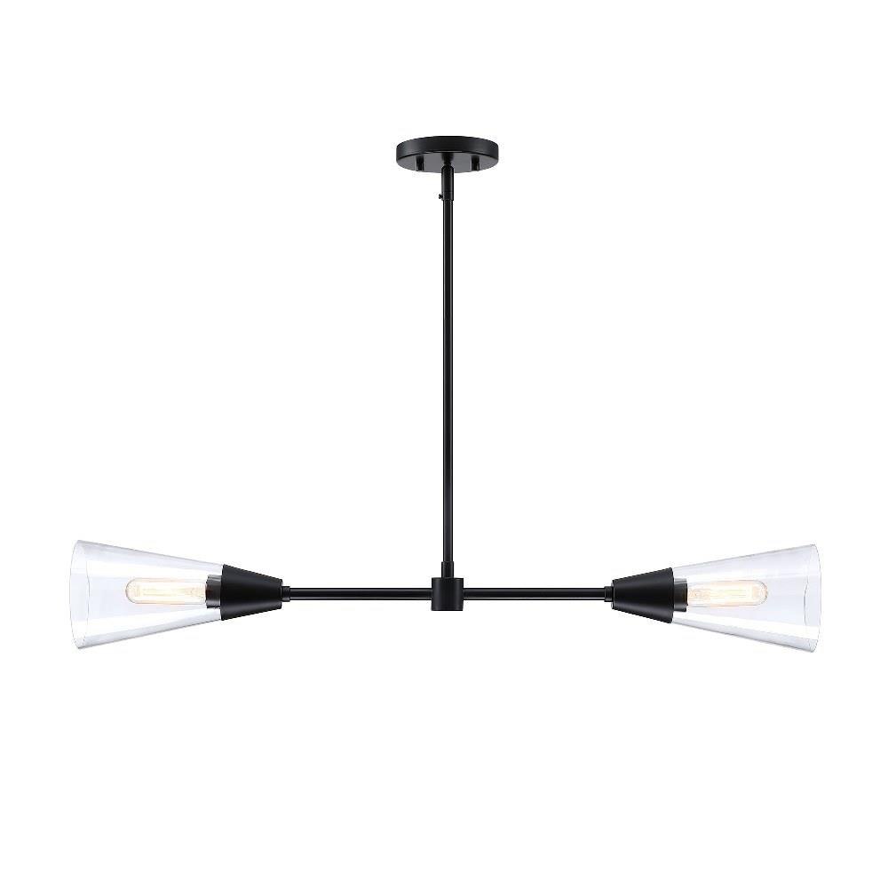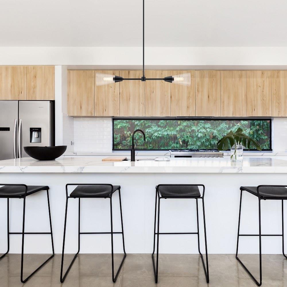 • Modern island light in Matte Black with Clear Glass shades