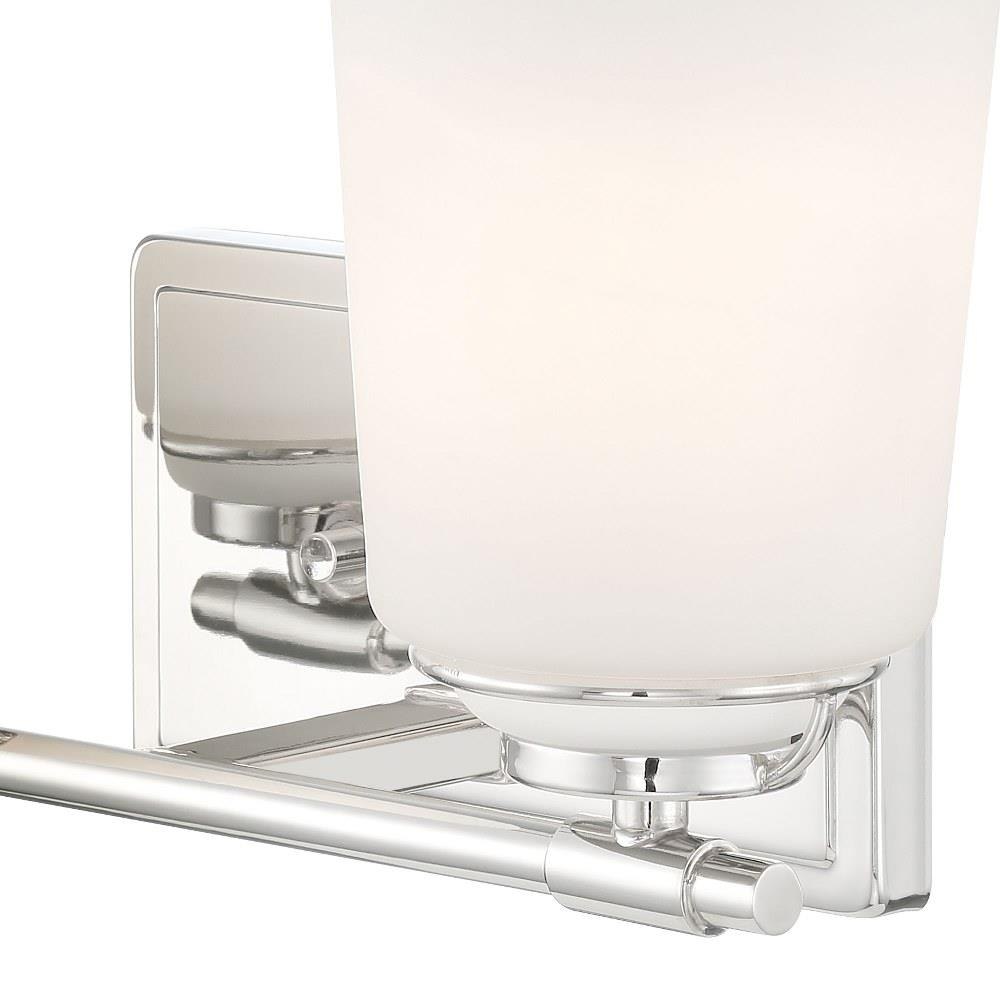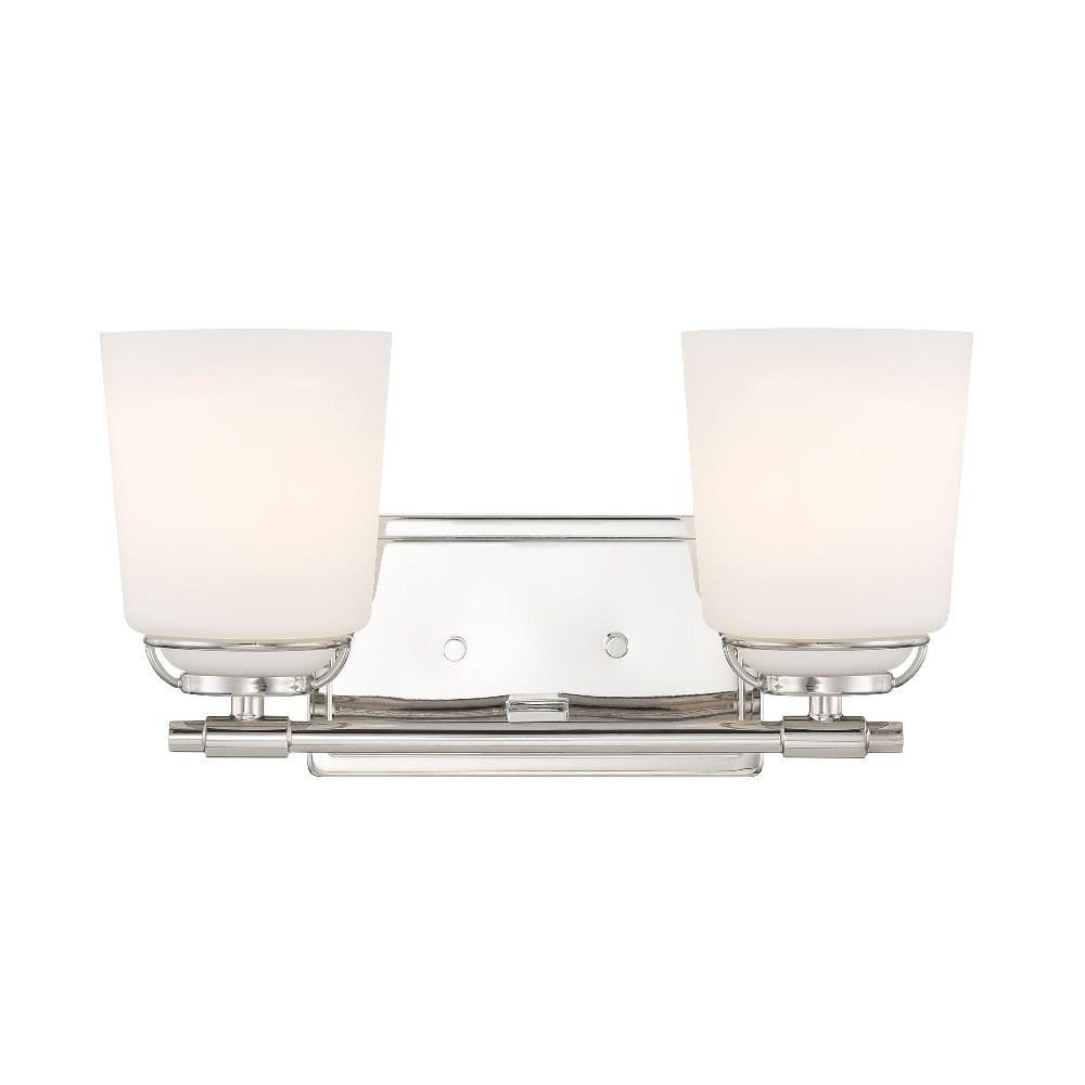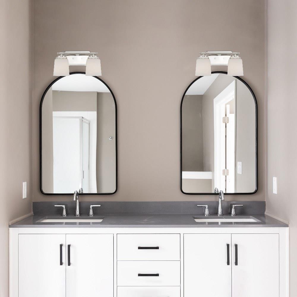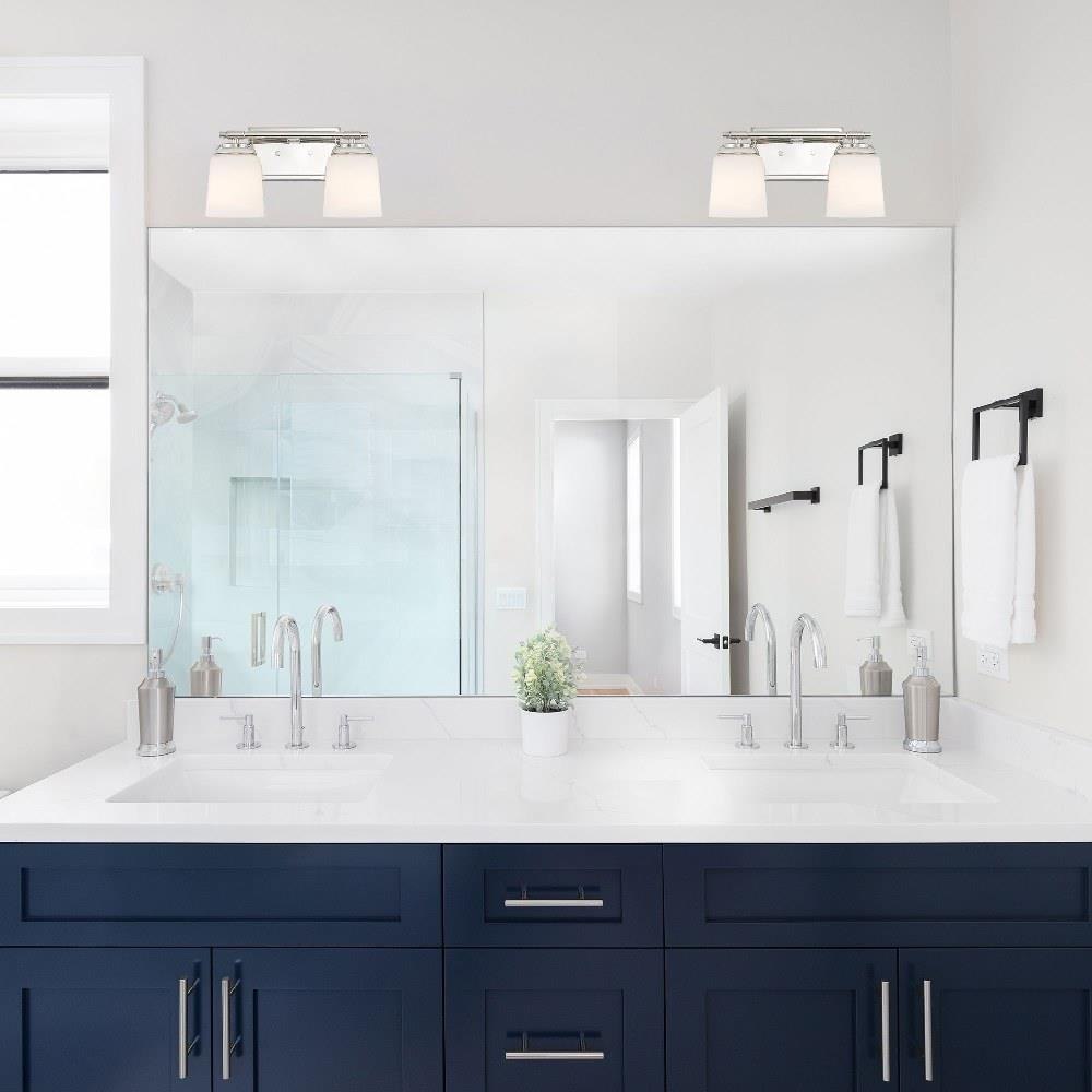 • Modern vanity in Polished Nickel with Etched Opal Glass shades