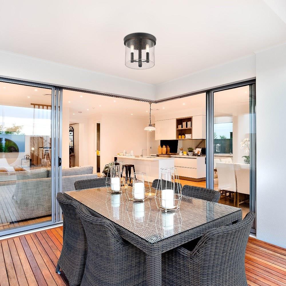 The clear seedy glass shades of the Otto collection will provide interesting light patterns to your outdoor spaces at night. The transitional aesthetic of Otto means that it will feel at home with any exterior décor. The Otto flush mount is suitable for damp outdoor or indoor environments and should be wired to a 120V power source.