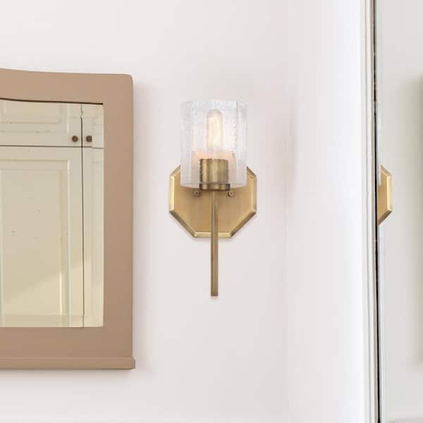 Haven 7 in. 1-Light Old Satin Brass Classic Wall Sconce with Clear Rippled Glass Shades for Bathrooms