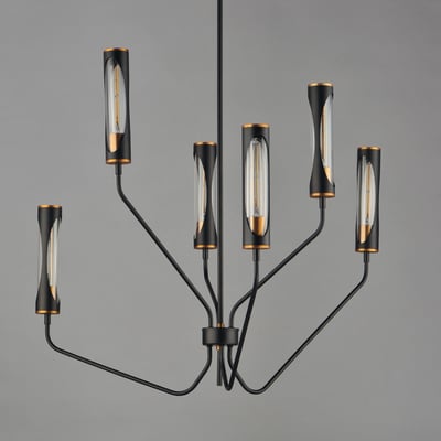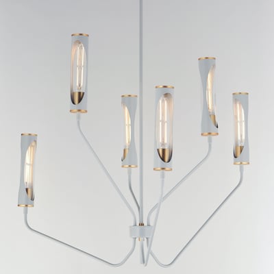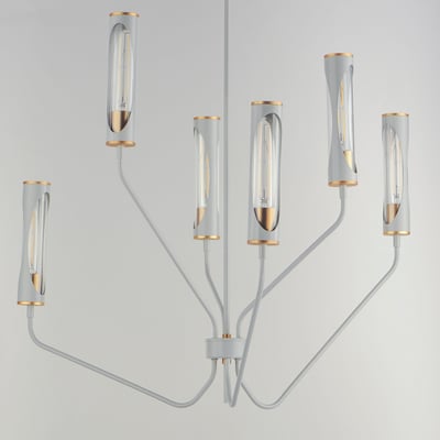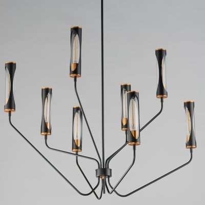 The Regent Chandelier elevates modern elegance with its striking two-toned design and layered materials. This captivating lighting piece features tubular lamps encased in glass tubes and metal shades, showcasing a unique interplay of light and form.