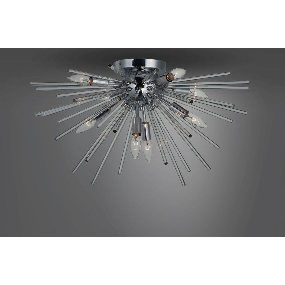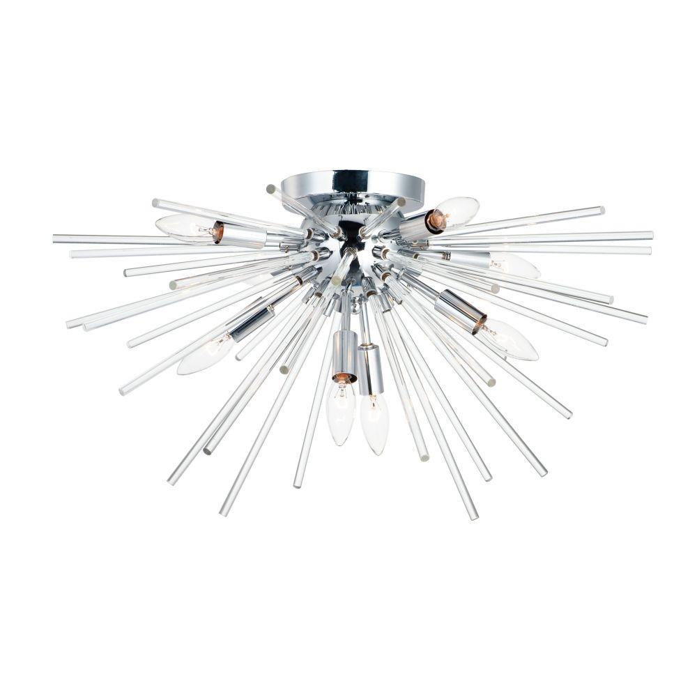 A dazzling burst of Clear glass rods extend from a classic sputnik shape finished in a bright Polished Chrome or warm Satin Brass. Available in two sizes of pendants and as a ceiling fixture, this unique look is a statement piece designed to attract attention.