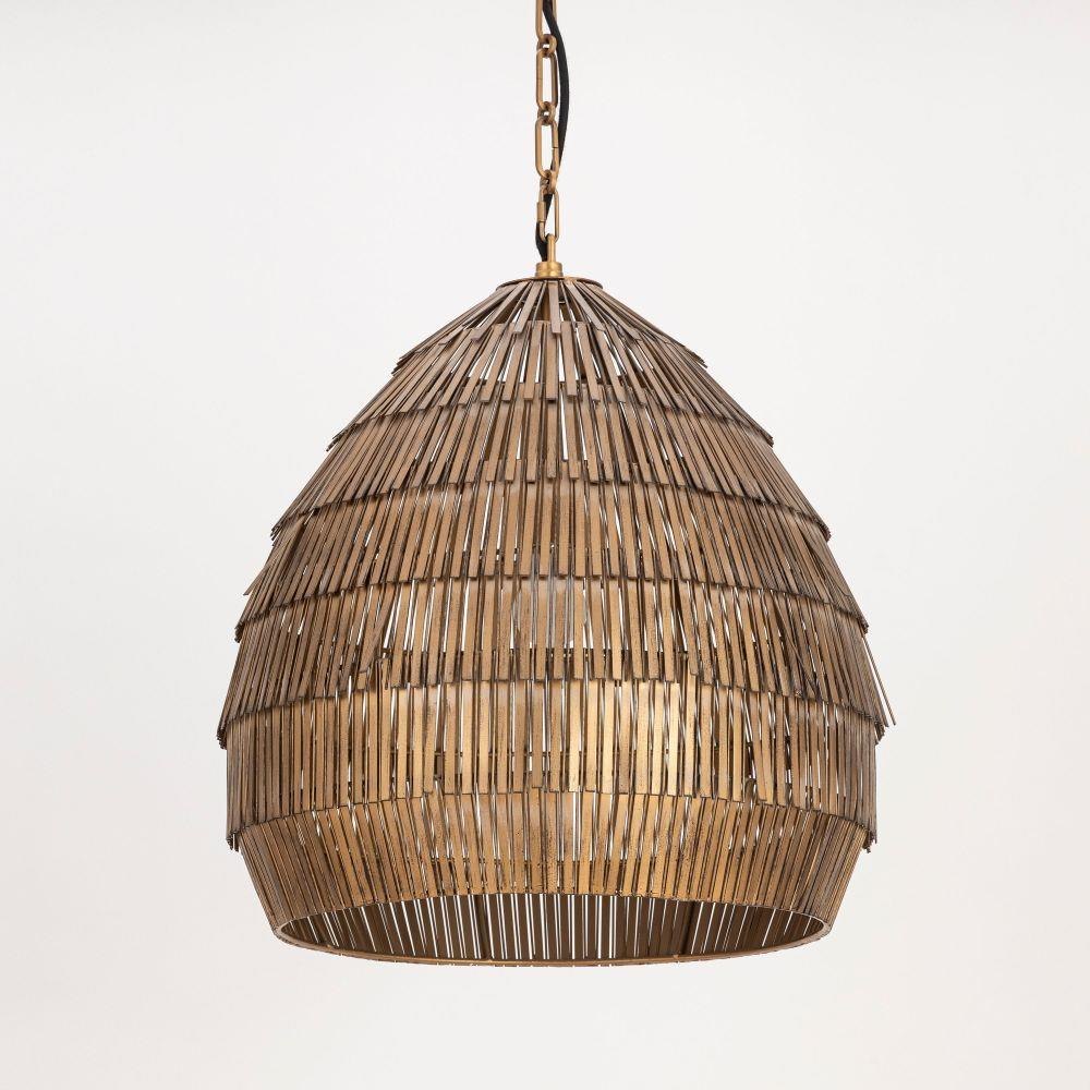 Celebrating artisanal craftsmanship, the Gilda collection offers an elevated, textural presence effortlessly. Strands of hand-strung metal in an Antique Brass finish cascade in concentric layers, adding depth and tonal richness. Suspended from a coordinating decorative chain, the pendant casts a warm, ambient glow that filters through the intricate latticework. With its moody shimmer, the pendants add bold depth and atmosphere to interior spaces. Available in multiple sizes to suit entryways, dining rooms, and beyond.