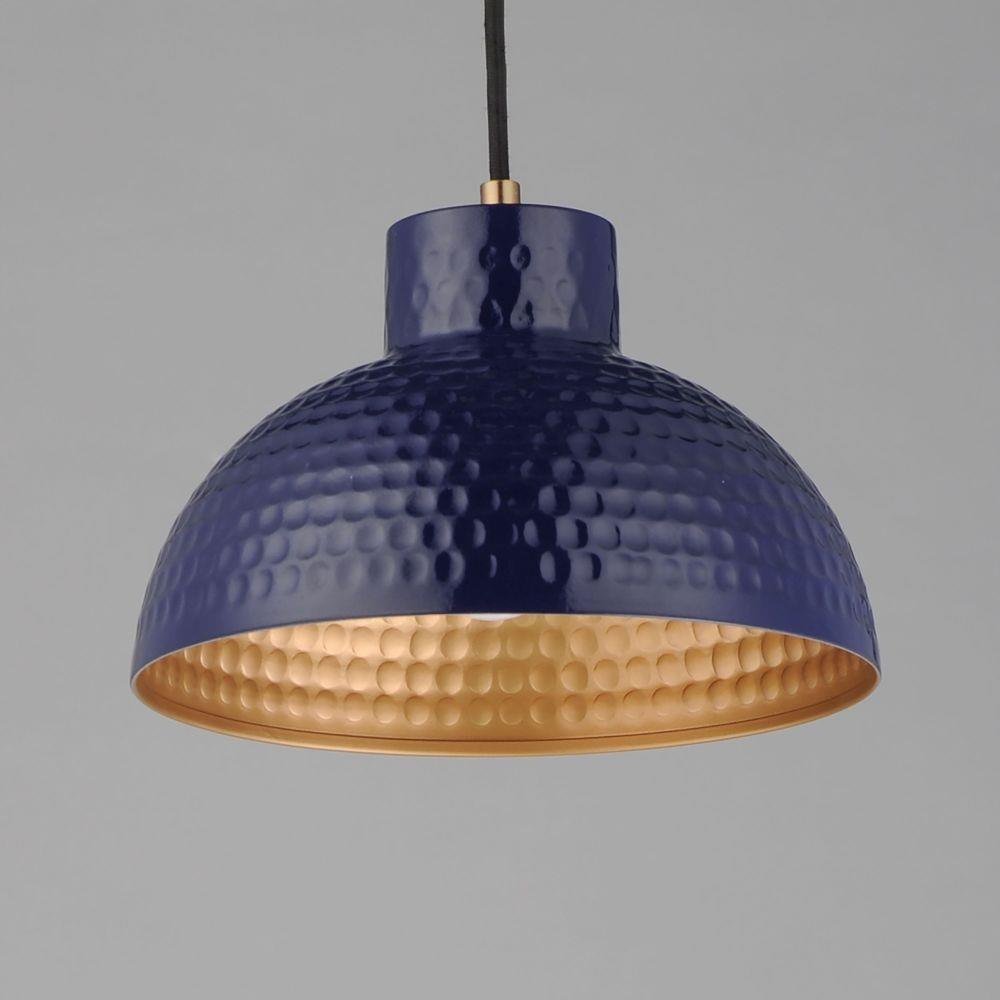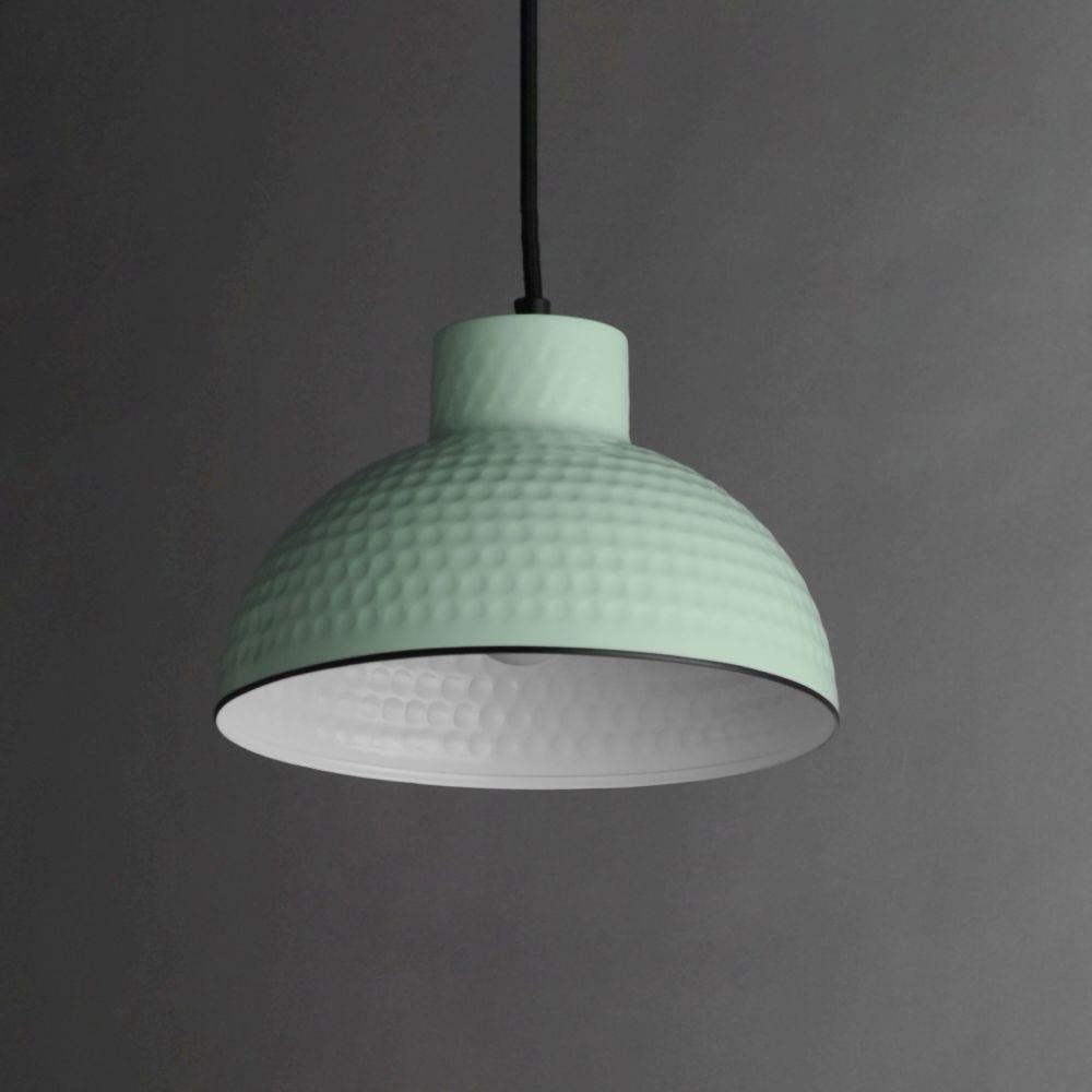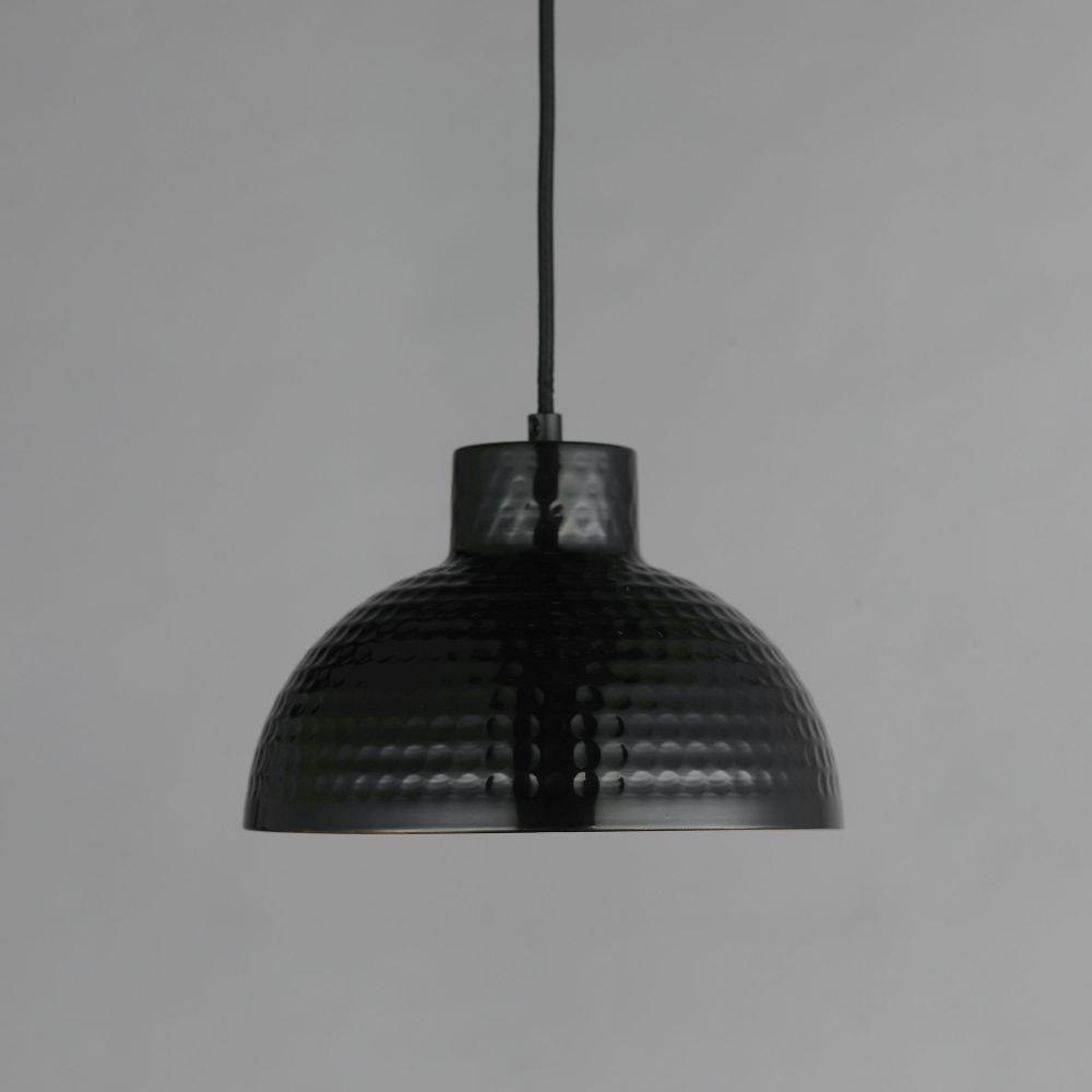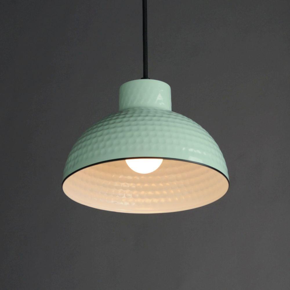 Hammered metal dome shades are painted in glossy enamel paints that welcomes a nautical look. Available in Sage Green with a glossy white interior or Glossy Black with an Antique Copper interior, these pendants embody a nostalgic element that prevails along coastline bungalows and cottages Black Rayon fabric cord adds designer details to the overall construction. Available in ten inch and twelve-inch diameters.