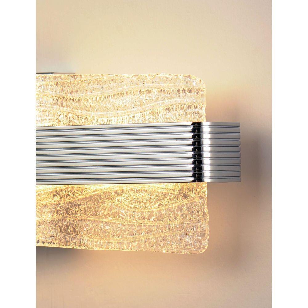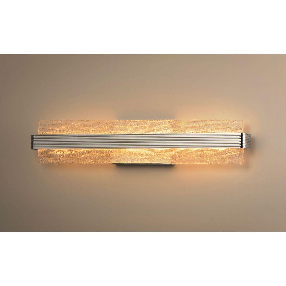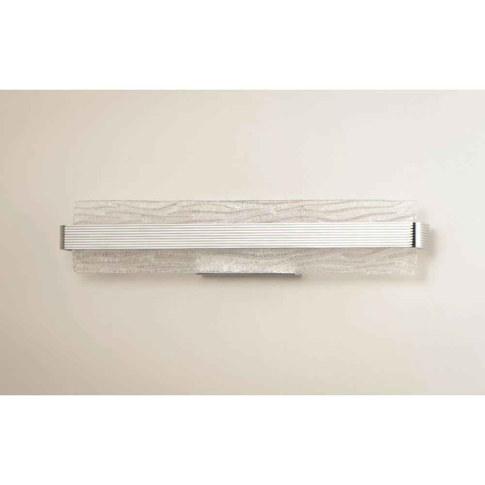 A rippled horizontal bar in Polished Chrome illuminates hand-crafted artisanal Piastra-style glass. The glass's intricate texture creates an interesting light effect on the wall. Can be mounted either vertically as a wall sconce or horizontally over a mirror.