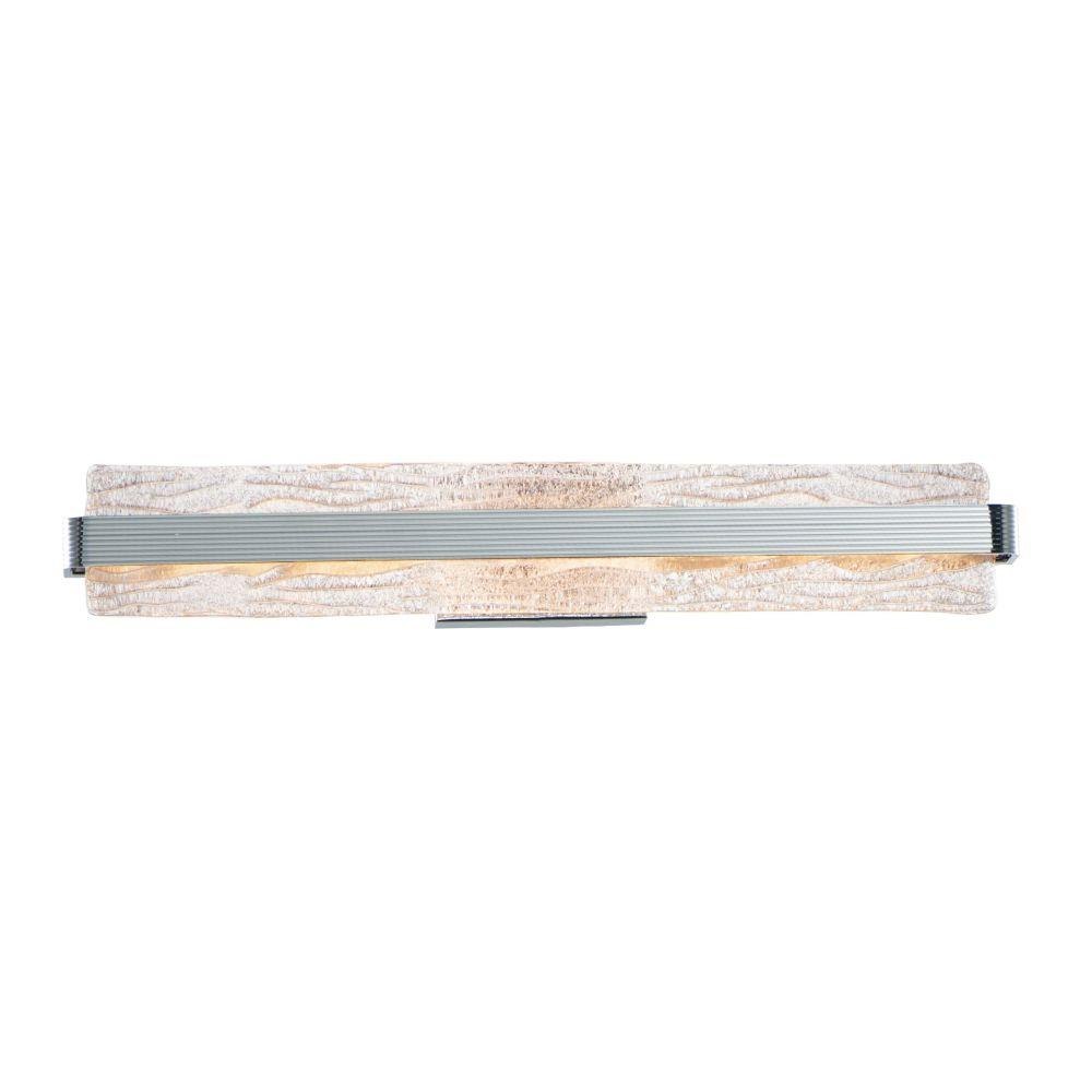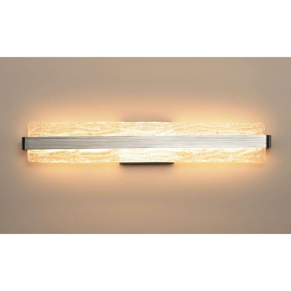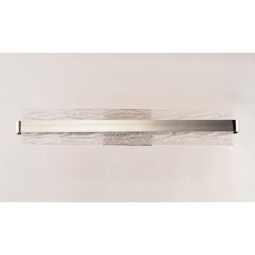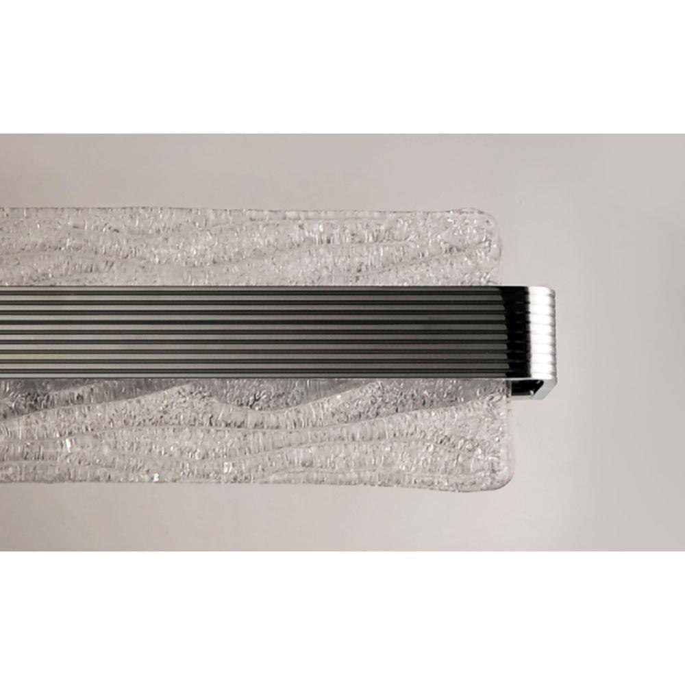 A rippled horizontal bar in Polished Chrome illuminates hand-crafted artisanal Piastra-style glass. The glass's intricate texture creates an interesting light effect on the wall. Can be mounted either vertically as a wall sconce or horizontally over a mirror.