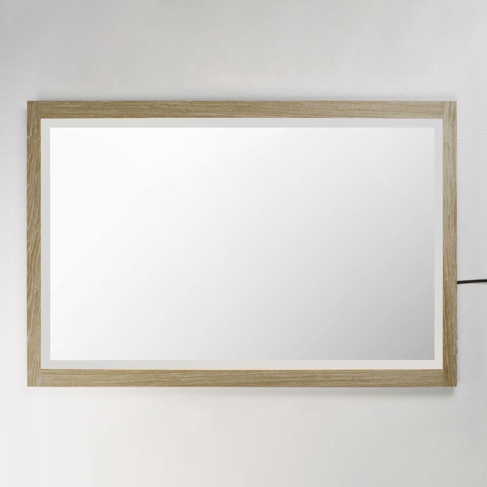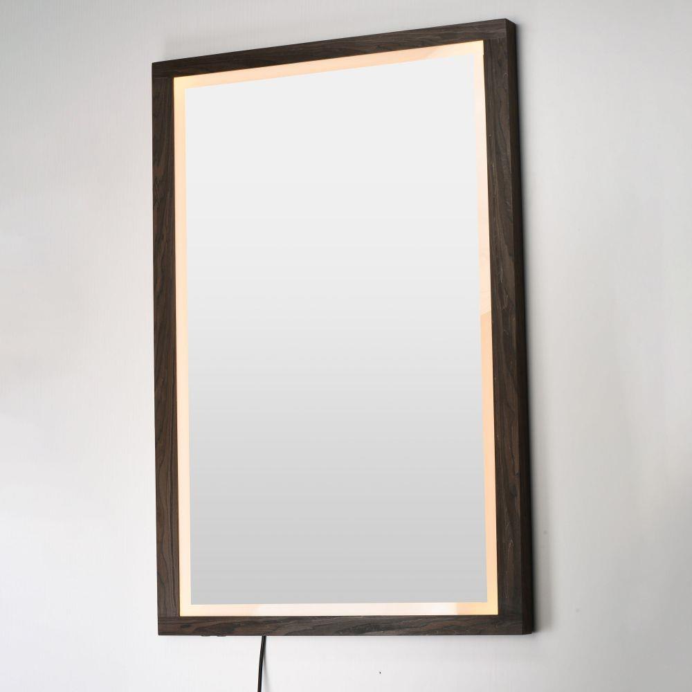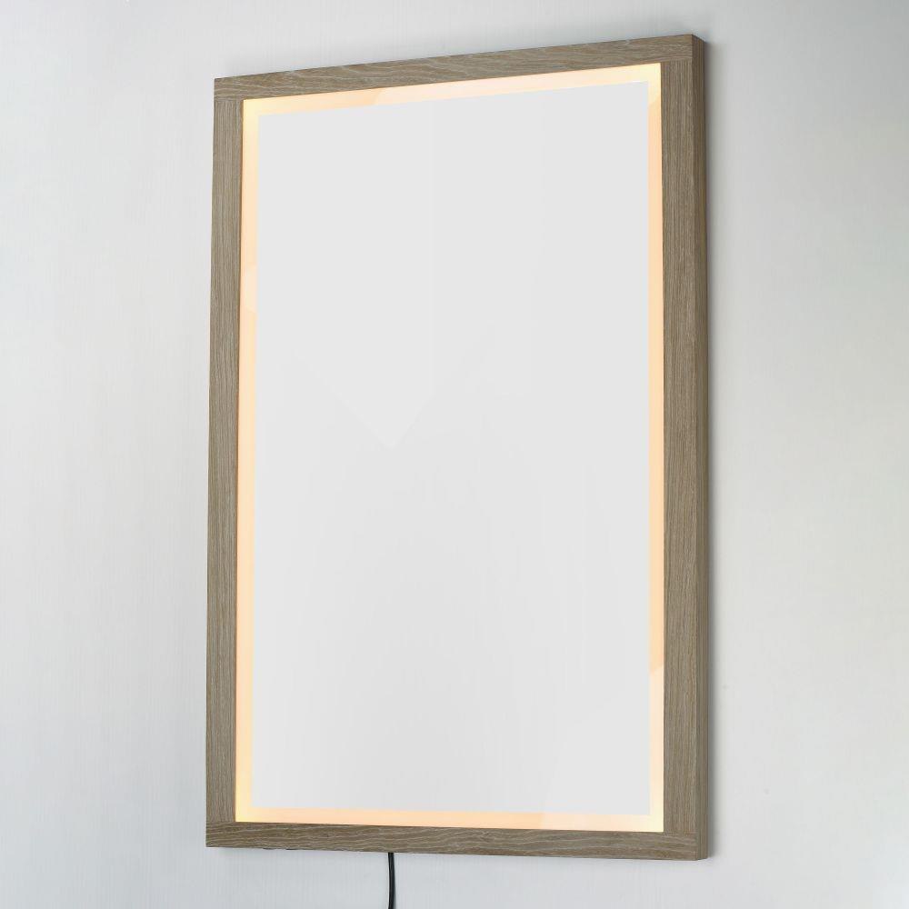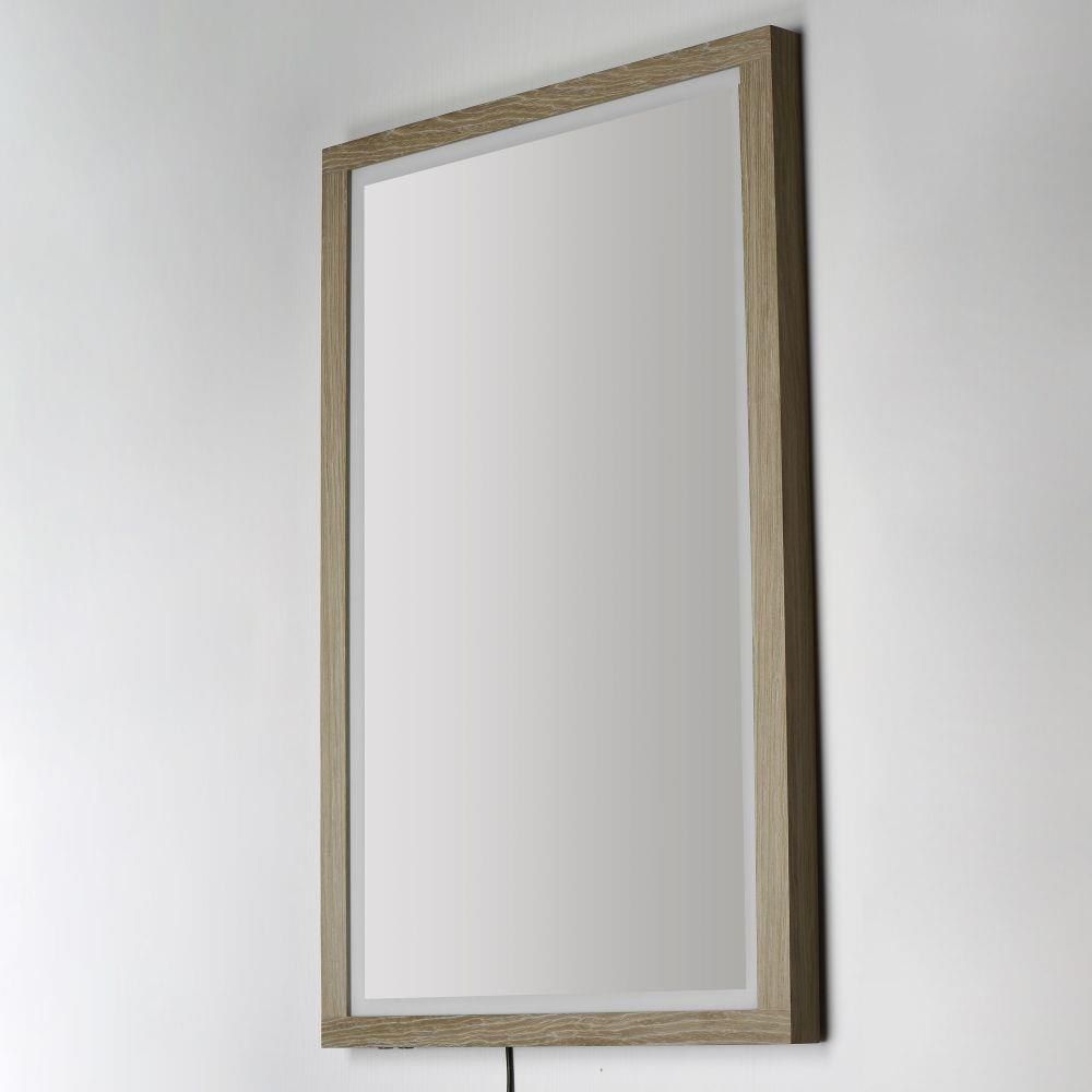 A wood-framed mirror is offered in a choice of Walnut or Distressed Oak, combining natural elements with modern functionality. A 2-inch frosted band along the frame's interior is backlit with LEDs, providing optimal illumination above a vanity. A discreetly hidden control along the edge of the frame allows easy selection between 3000K, 4000K, and 5000K color temperatures for personalized lighting.