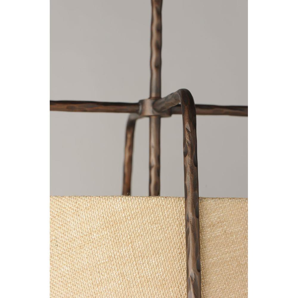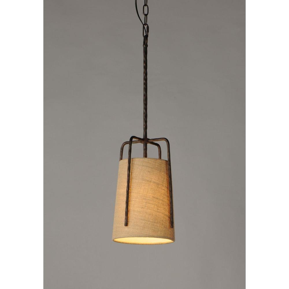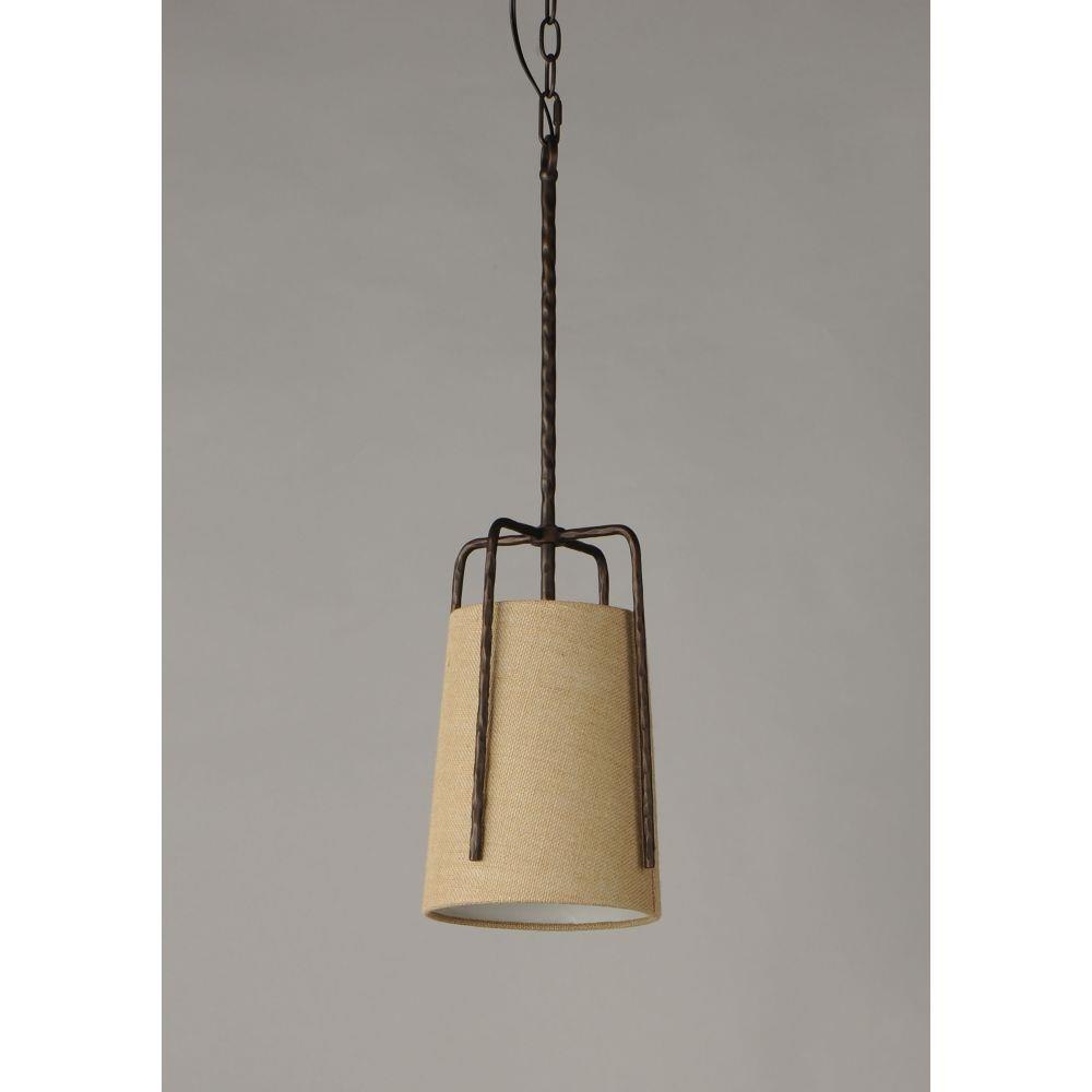 Rustic pendants of hammered iron finished in Oil Rubbed Bronze embraces a shade of Burlap fabric to create a casually comfortable appeal. Available in 2 sizes which allows for multiple pendants over a bar or a single pendant over a table.