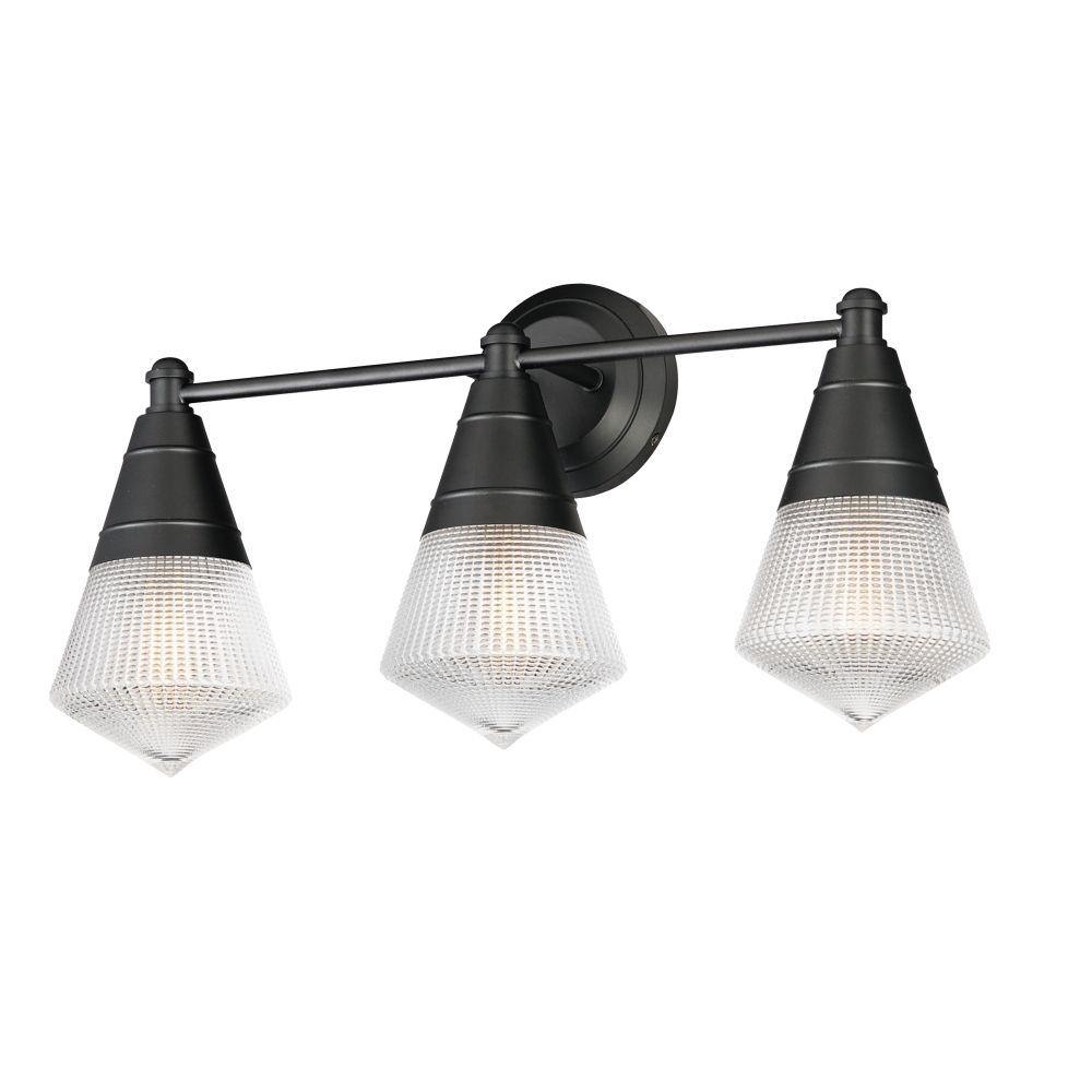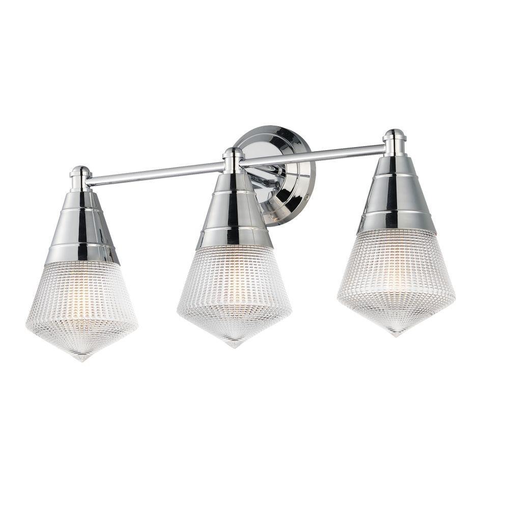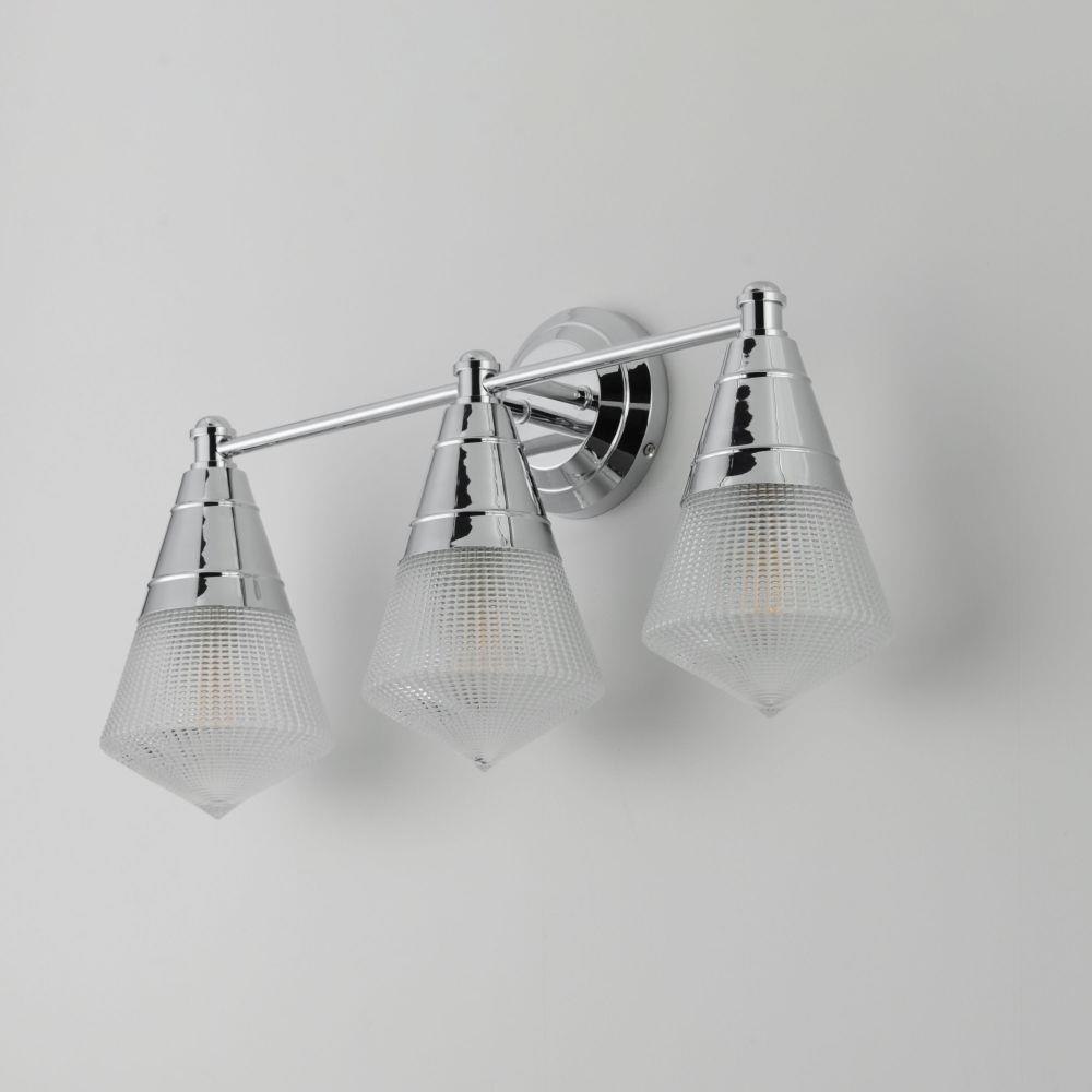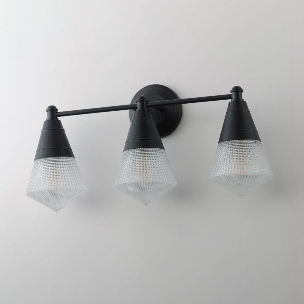 A prismatic diffusion of light is housed within pressed cone glass shades. Choose from pendants with tapered metal halves that conceal the light source or glass shades that are supported by a metal ring. Coordinating bath vanity lights complete the collection.